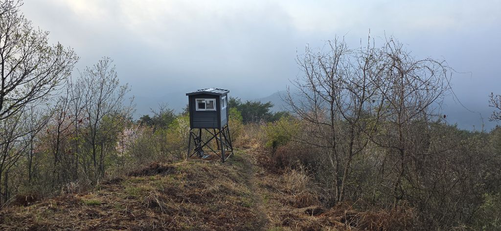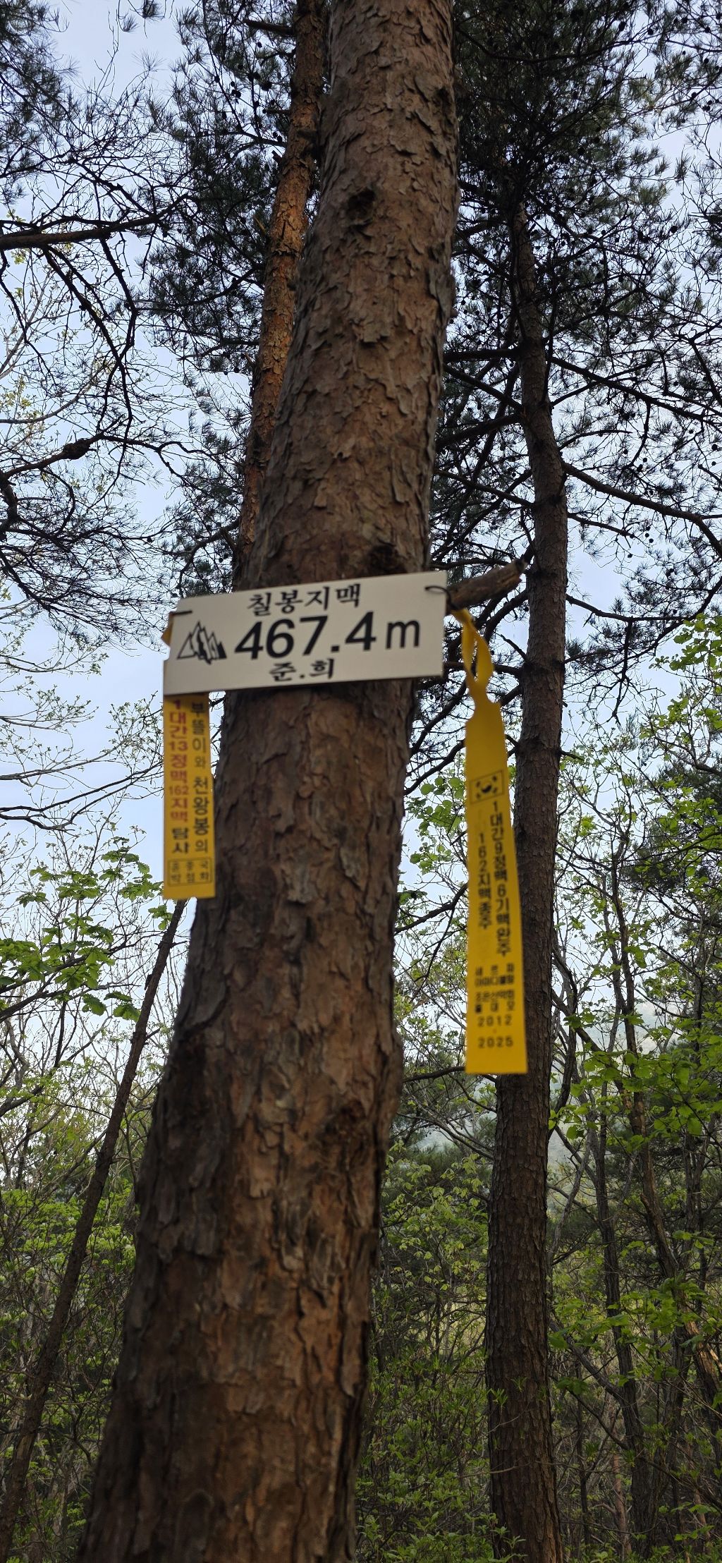 - 인증을 하고 다시 내려서 금오지맥은 좌측으로 진행이고 칠봉지맥은 조금 더 내려서 좌측으로 내리면 산불감시탑을 보면서 본격적으로 칠봉지맥은 진행됩니다 바로 잡목이고 잡목을 헤치고 내리고 오르면 467.4 봉이 나옵니다
