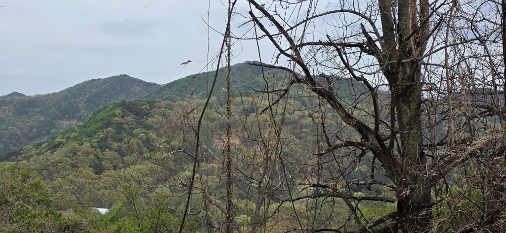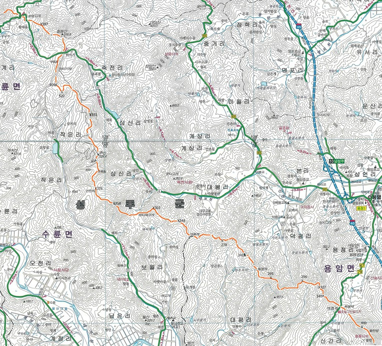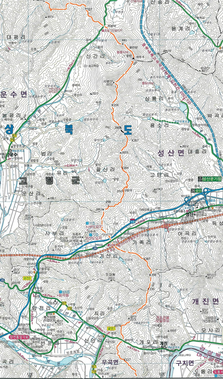 - 옥화 교차로 백하여 마을로 접속하여 지맥을 접속이 애매합니다 방향보고 접속이 어려운 방향으로 하여서 개고생입니다 마을로 가서 접속하여 임도로 진행이 쉽다고 합니다 227.2m 봉을 만나고 지맥은 우틀로 진행입니다 374.4봉을 지나고 다시 오름으로 하여 진행하여 호령고개 도착입니다