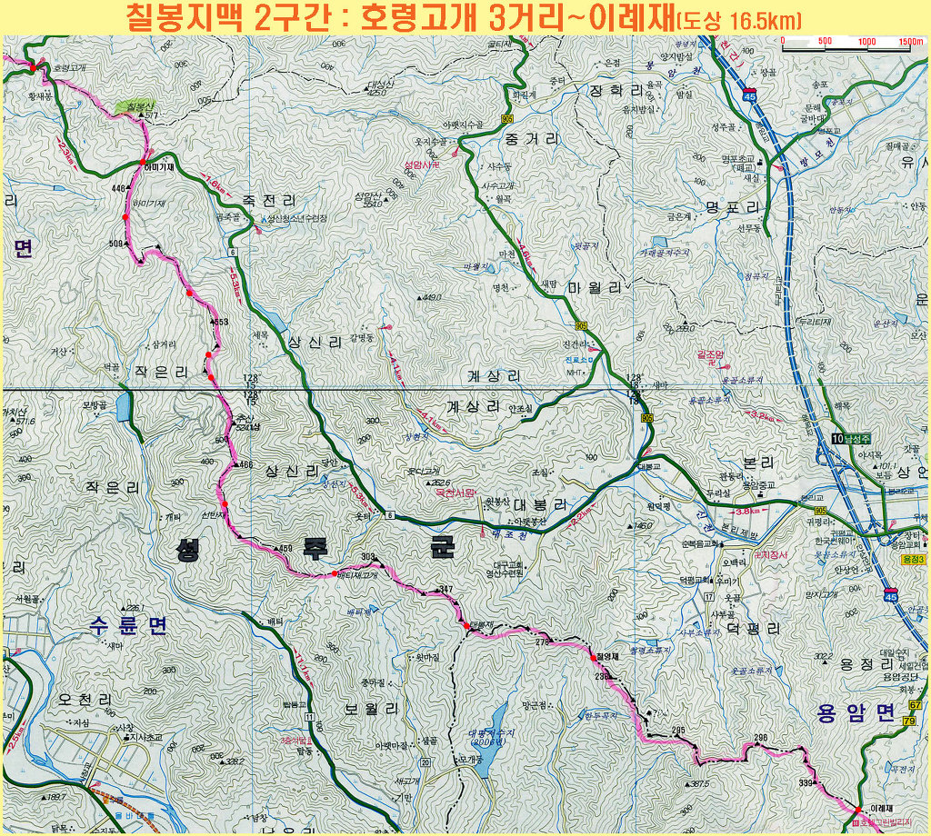 산행코스: 살티재-염속봉산(679.3m)-칠봉지맥분기점-467.4봉-적산(570.1m)-393.5봉-268.9봉-고름재(30번 국도)-에 그 너 재-315.8봉-284.2봉-땅고개(33번 국도)-뫼재-227.2봉-374.4봉-호령고개-913번 도로