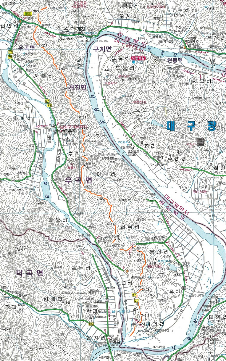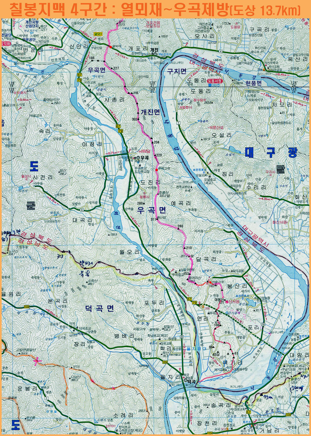 염속봉산(649m) 적산(510m) 고름재(30번 국도)에 그 너 재 할미산성 땅고개(33번 도로) 호령고개 칠봉산(517m) 하미기재 추산(524.1m) 배티재 이레재(79번 도로) 의봉산(551m) 담밑재 기산고개 (88번 고속도로) 청룡산( 300.2m) 용머리산 (179m) 대봉산(121.0m) 67. 번 79번 도로이고 지맥의 끝인 경북 고령군 우곡면 객기리는 서쪽과 남쪽은 경남 창녕군과 접하고 동쪽은 대구시와 접하는 삼도경계가 된다