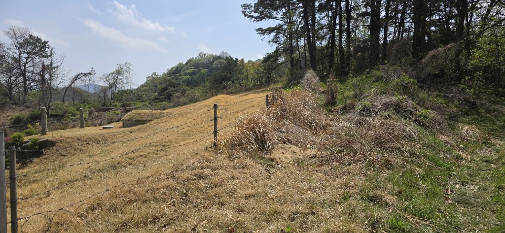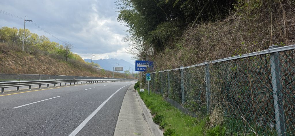 - 임도가 나옥 민간가 있고 민가 우측으로 오르는데 무더위로 다리가 풀리기 시작입니다 겨우 올라서 284.2봉을 만나고 지맥은 우틀로 진행이고 트랙을 보고 진행하다 보니 국도로 철펜스를 넘어 내리고 철펜스 우측으로 진행 우회하여 옥화교차로 진행하여야 합니다