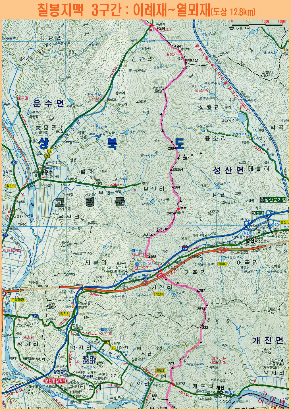 염속봉산(649m) 적산(510m) 고름재(30번 국도)에 그 너 재 할미산성 땅고개(33번 도로) 호령고개 칠봉산(517m) 하미기재 추산(524.1m) 배티재 이례재(79번 도로) 의봉산(551m) 담밑재 기산고개 (88번 고속도로) 청룡산( 300.2m) 용머리산 (179m) 대봉산(121.0m) 67번 79번 도로이고 지맥의 끝인 경북 고령군 우곡면 객기리는 서쪽과 남쪽은 경남 창녕군과 접하고 동쪽은 대구시와 접하는 삼도경계가 된다