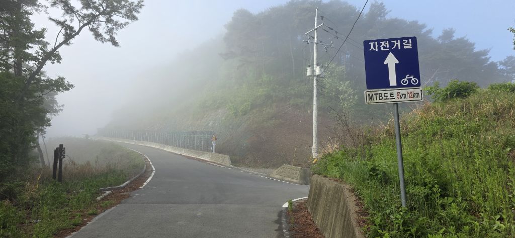 임도가 나오고 안개가 자욱하여 보이 지를 않습니다 좌측으로 접속하여 진행입니다