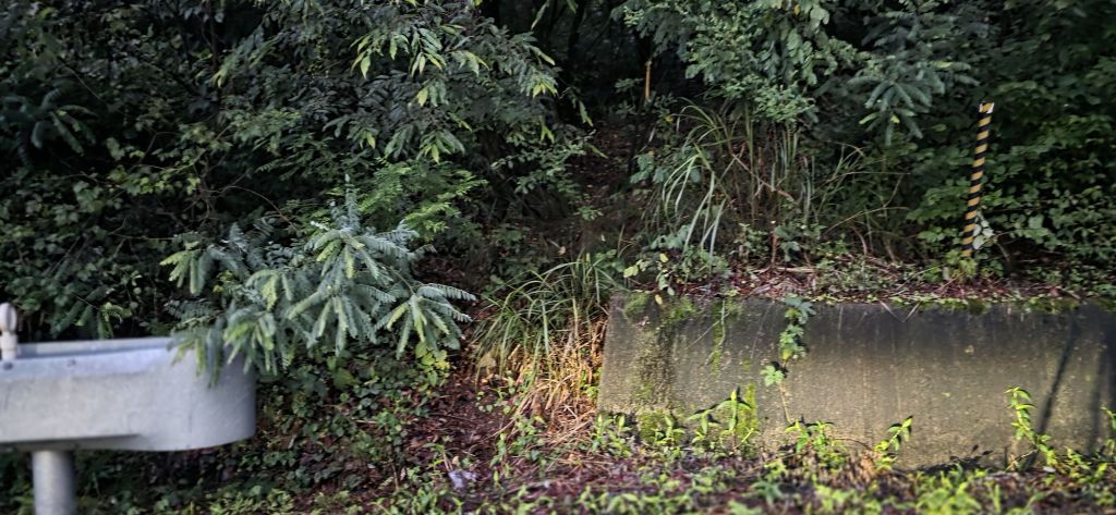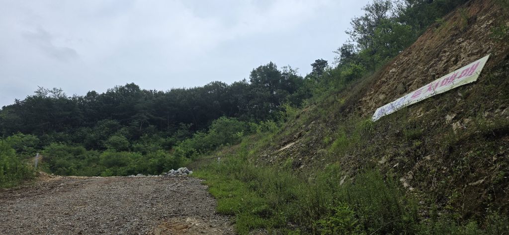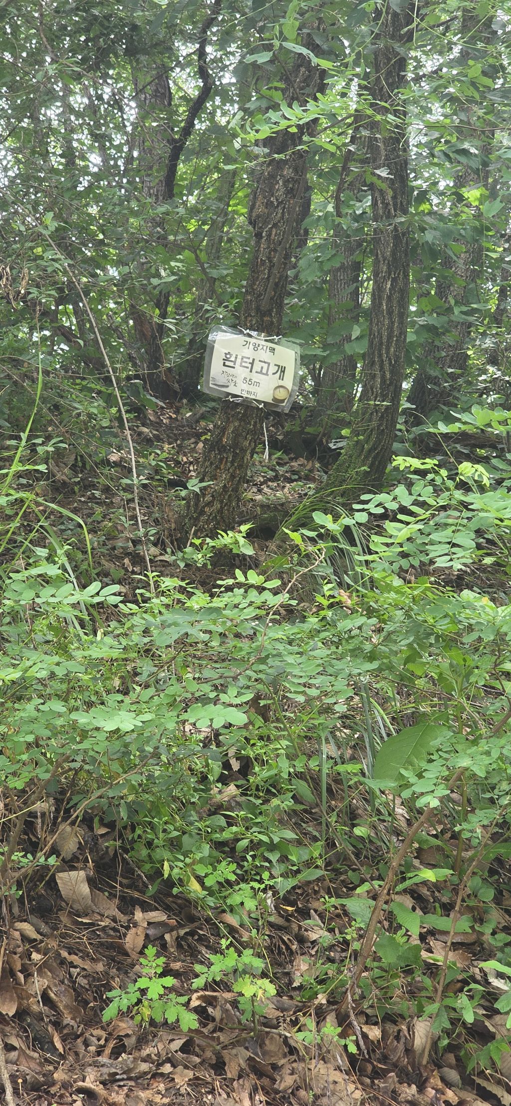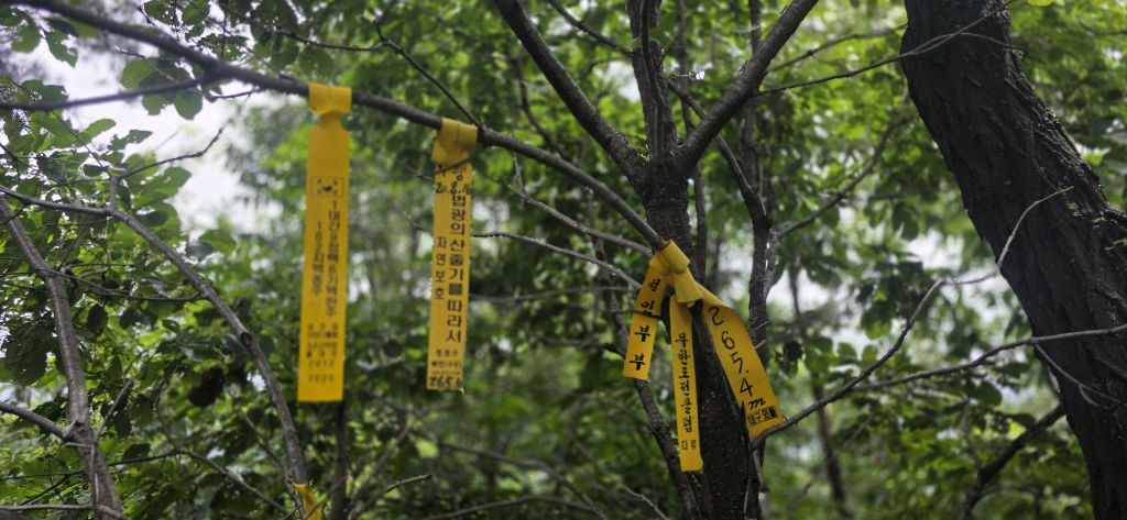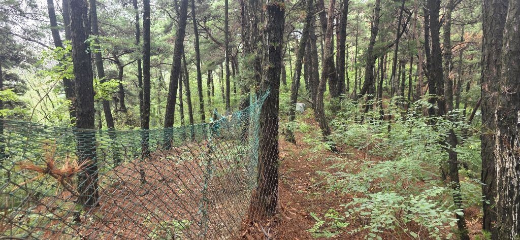 생태통로 건너고 발밑 철조망을 밟고 급경사로 힘겹게 마루금 접속하여 오름으로 진행입니다
