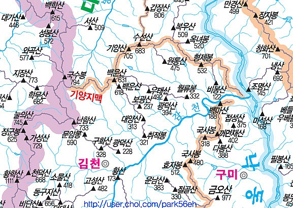 기양지맥은 백두대간의 용문산을 지나 국수봉 못 미쳐 동쪽으로 분기한 기양지맥은 백운산 기양산 수선산과 형제봉을 지나 낙동강으로 맥을 다하는 길이 45.8km 김천 상주와 구미지역의 지맥으로 좌측으로 병성강을 우측으로 감천을 흐르게 한다