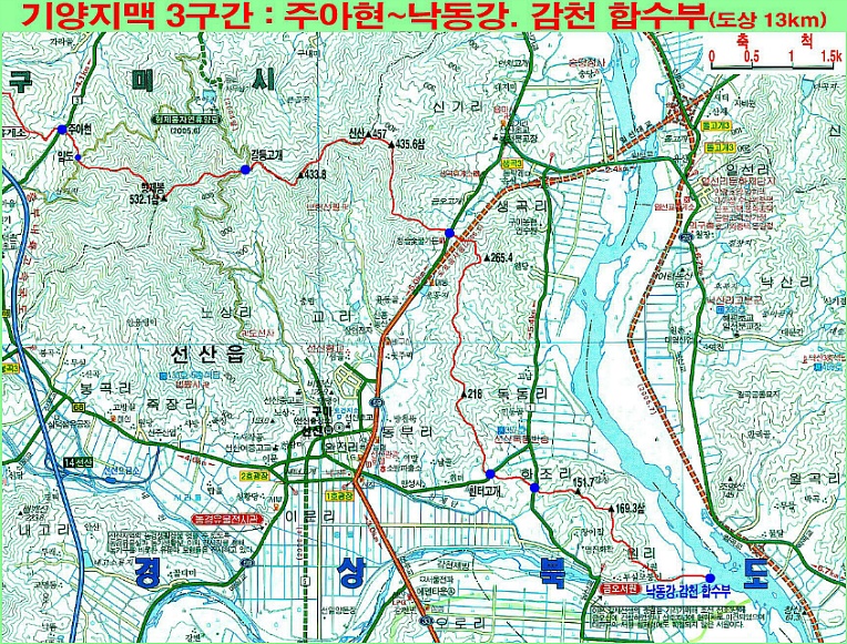 기양지맥 합수점 좌 낙동강 우 감천 인증을 합니다