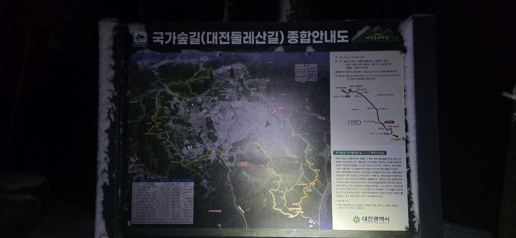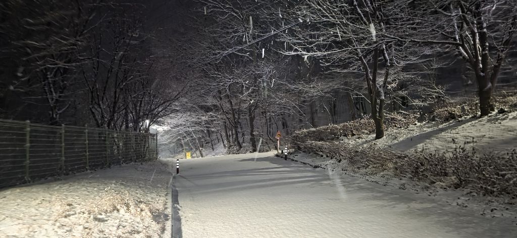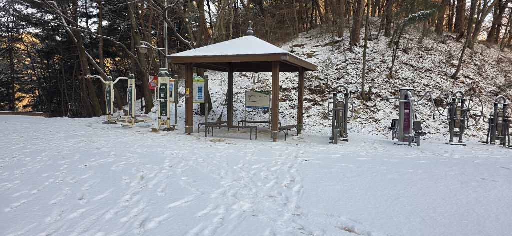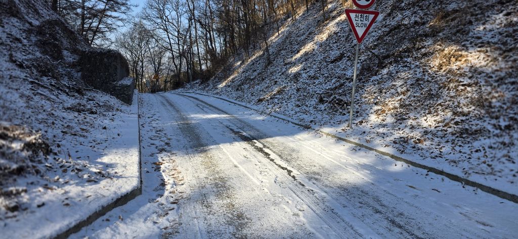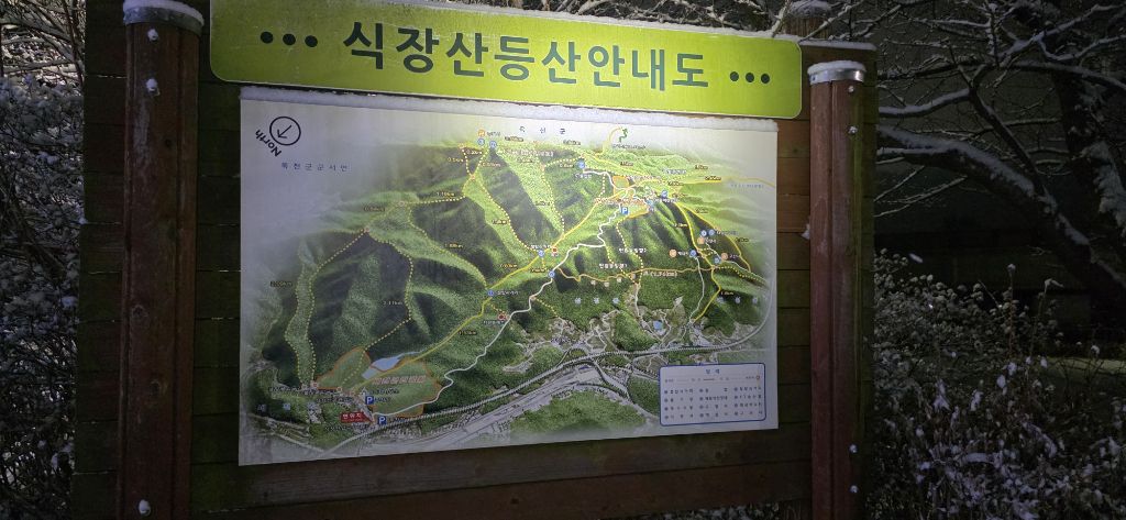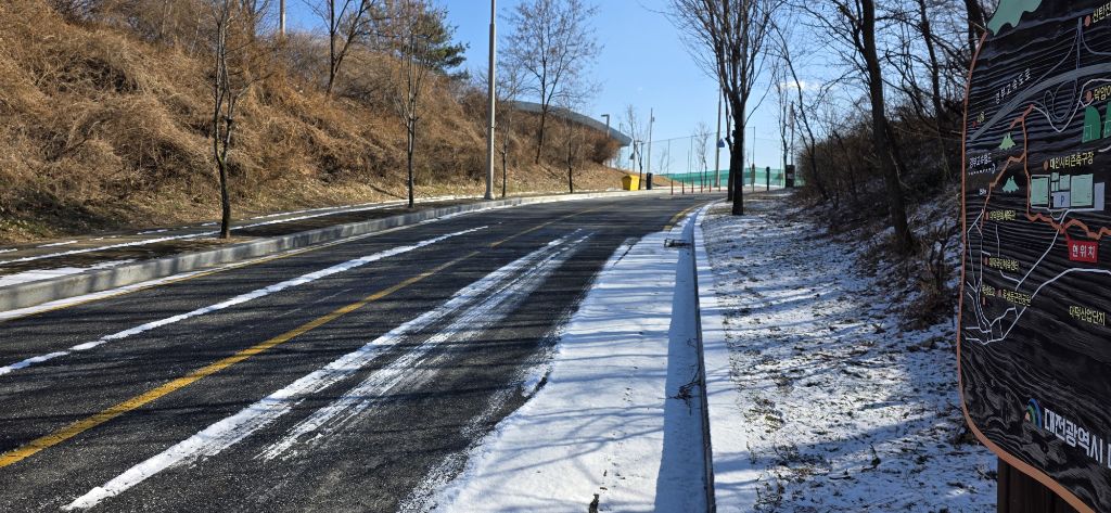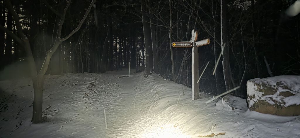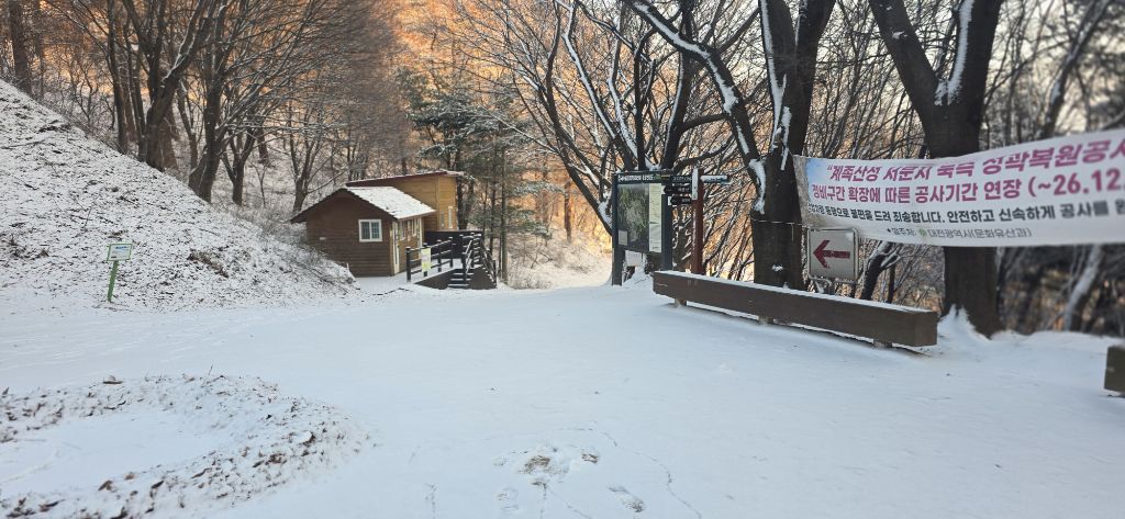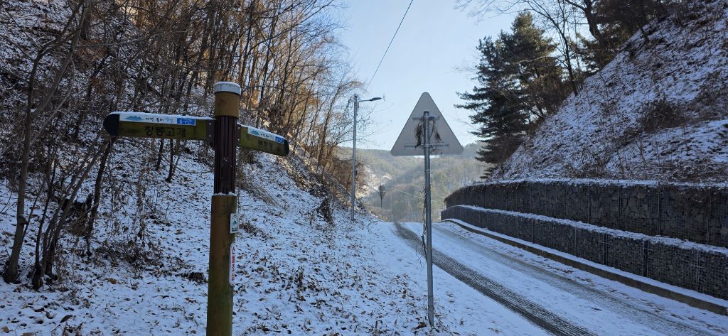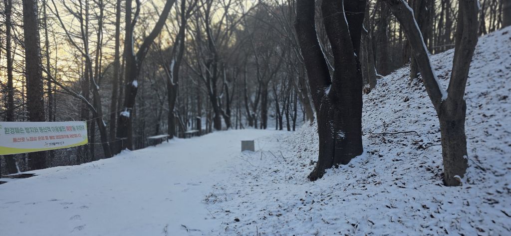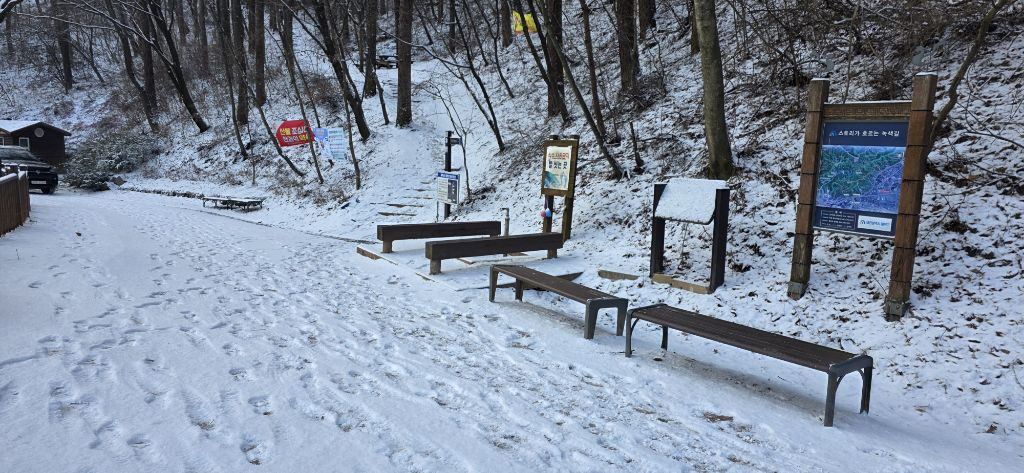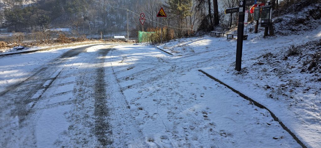 -식장지맥을 완성하기 위해서 지난번 날머리 세천공원 주차장으로 갑니다 겨울철 세천공원에서 식장산까지 차도는 폐쇄입니다 빙판길 위험하여 겨울철 도로는 폐쇄입니다 주차장 도착이고 잠시 휴식인데 새벽부터 눈이 오기 시작합니다 등산에 영향을 미칠정도는 아닌 눈이고 둘레길과 겹쳐서 등로가 양호하여 강행하기로 합니다