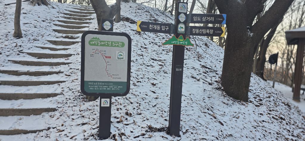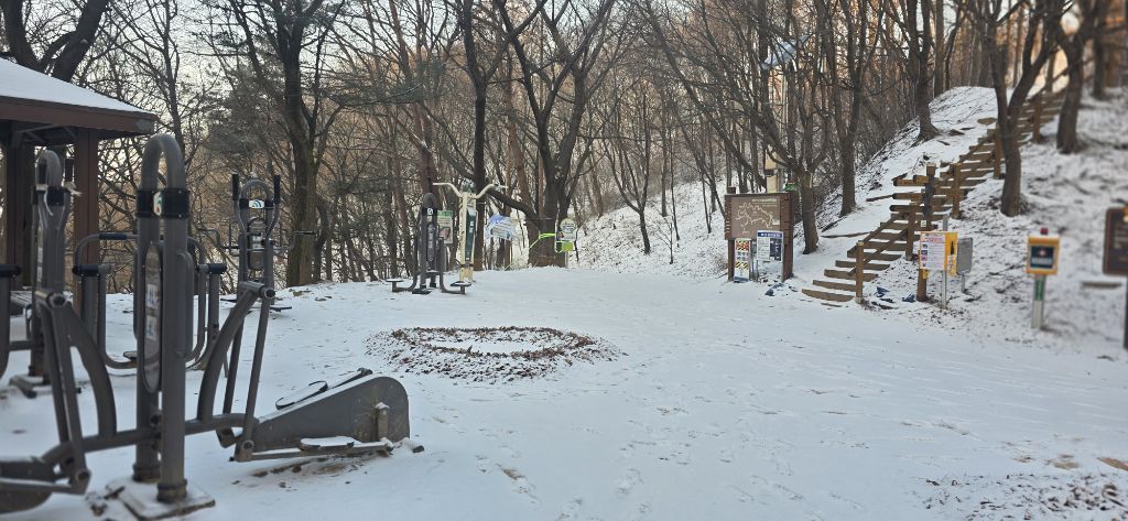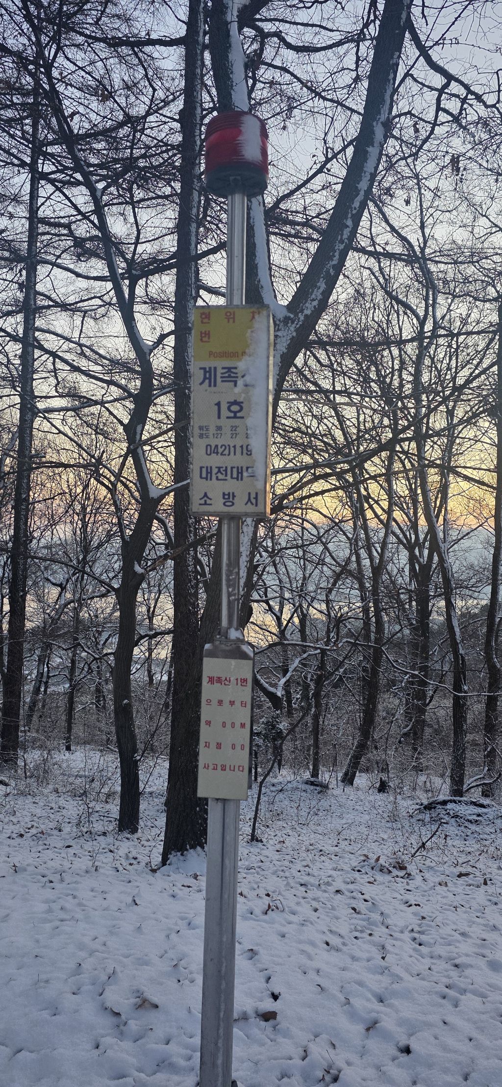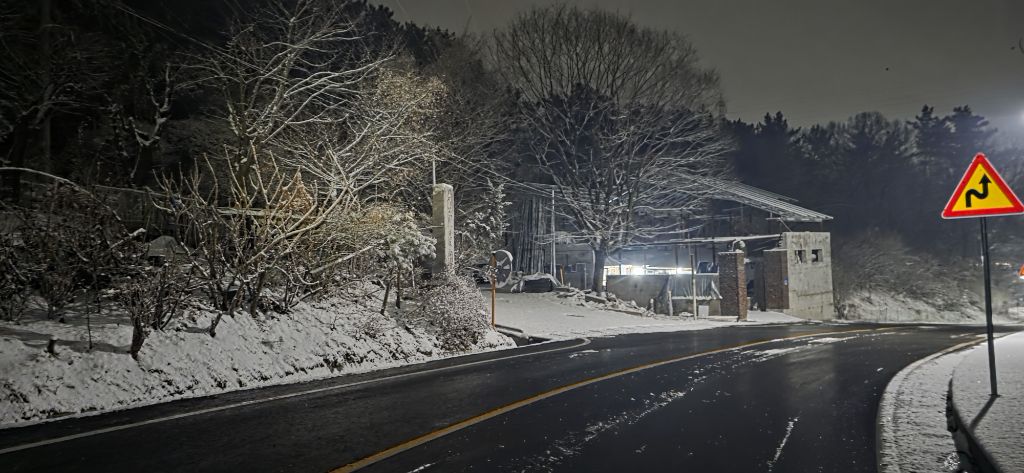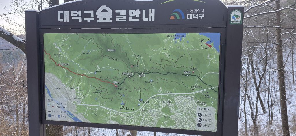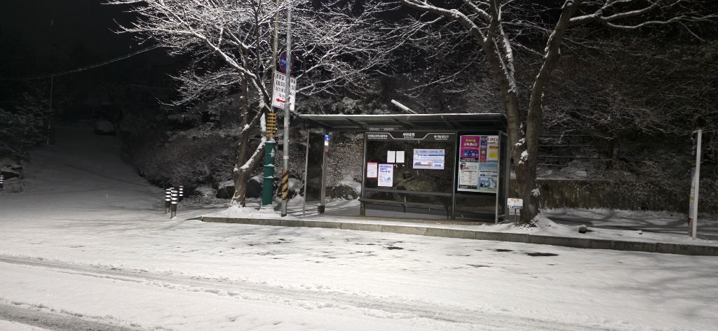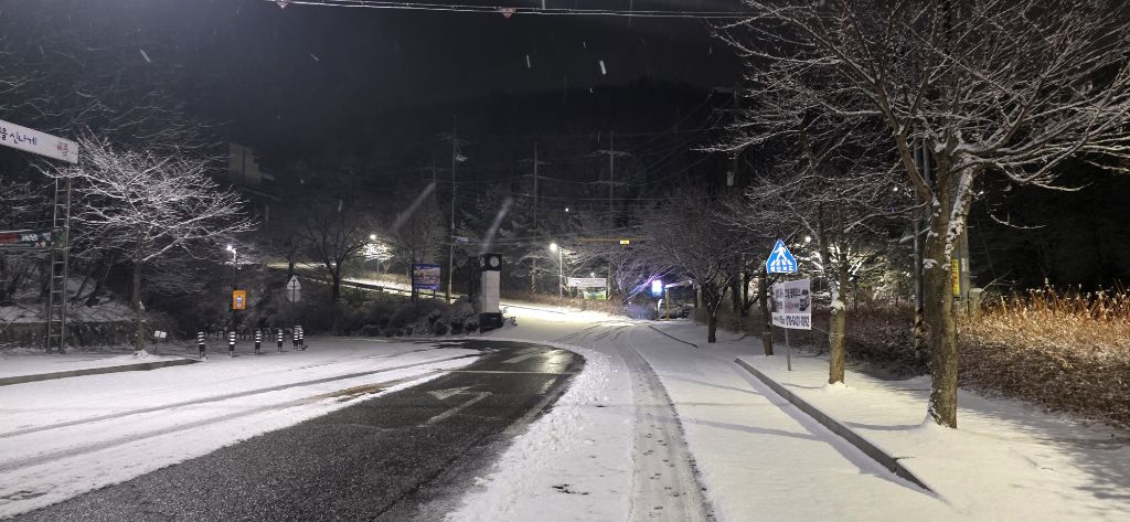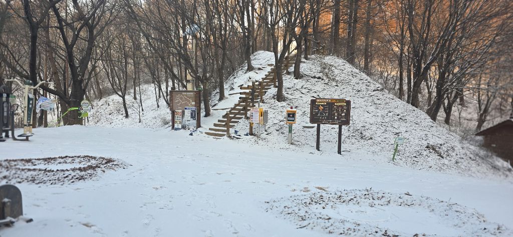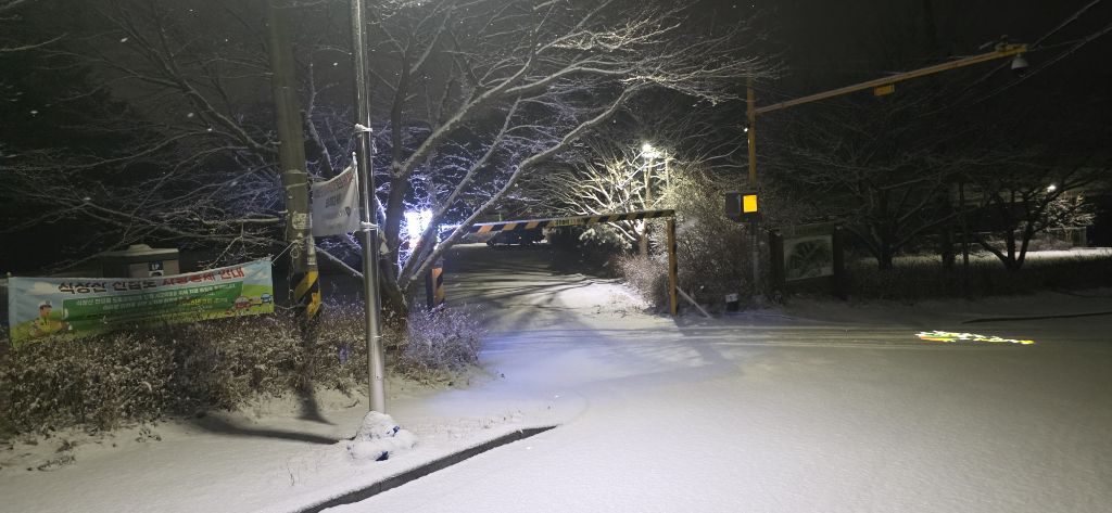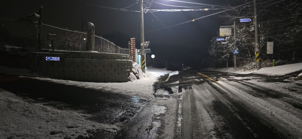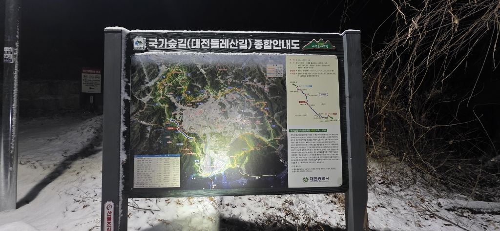 -식장지맥을 완성하기 위해서 지난번 날머리 세천공원 주차장으로 갑니다 겨울철 세천공원에서 식장산까지 차도는 폐쇄입니다 빙판길 위험하여 겨울철 도로는 폐쇄입니다 주차장 도착이고 잠시 휴식인데 새벽부터 눈이 오기 시작합니다 등산에 영향을 미칠정도는 아닌 눈이고 둘레길과 겹쳐서 등로가 양호하여 강행하기로 합니다