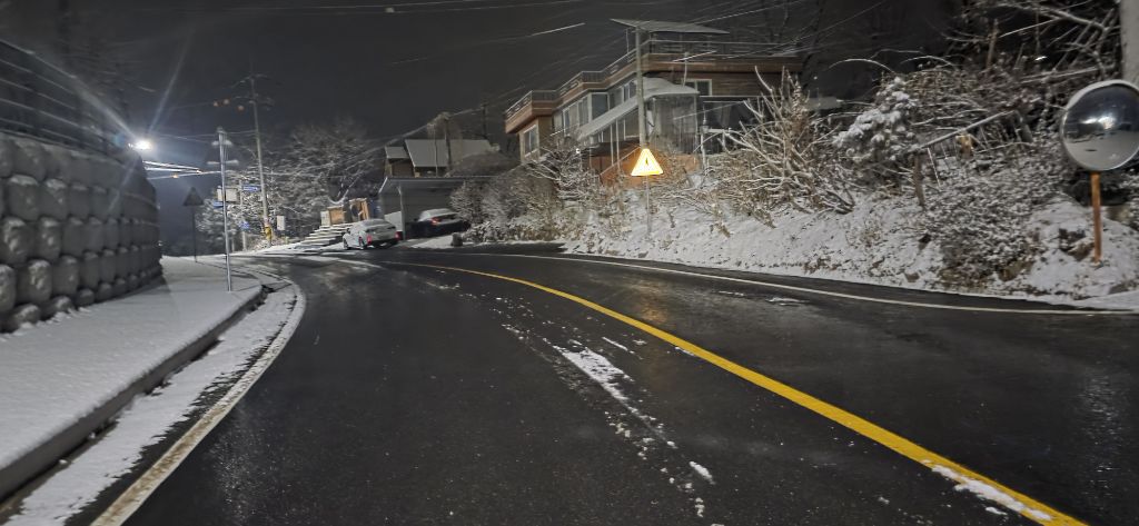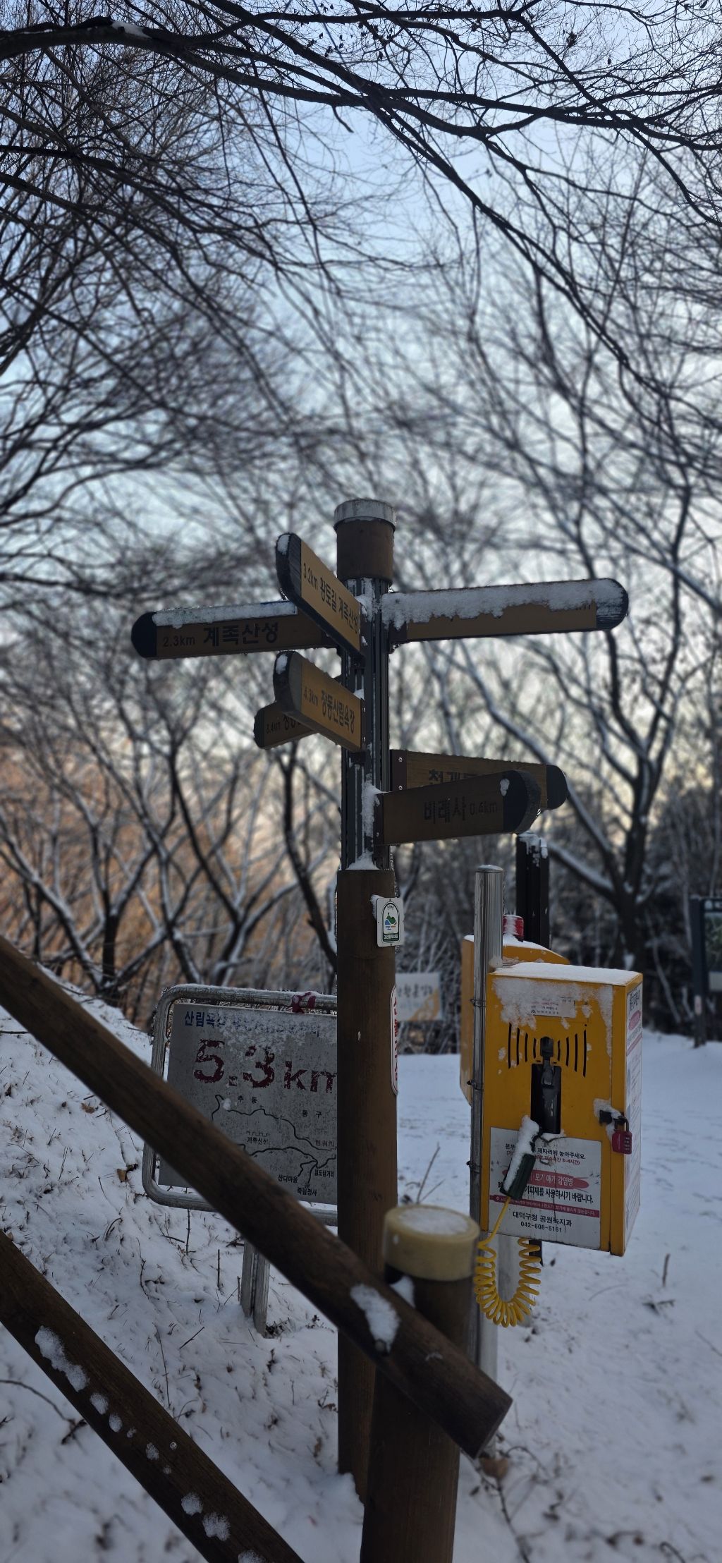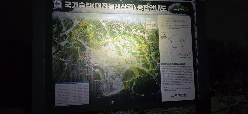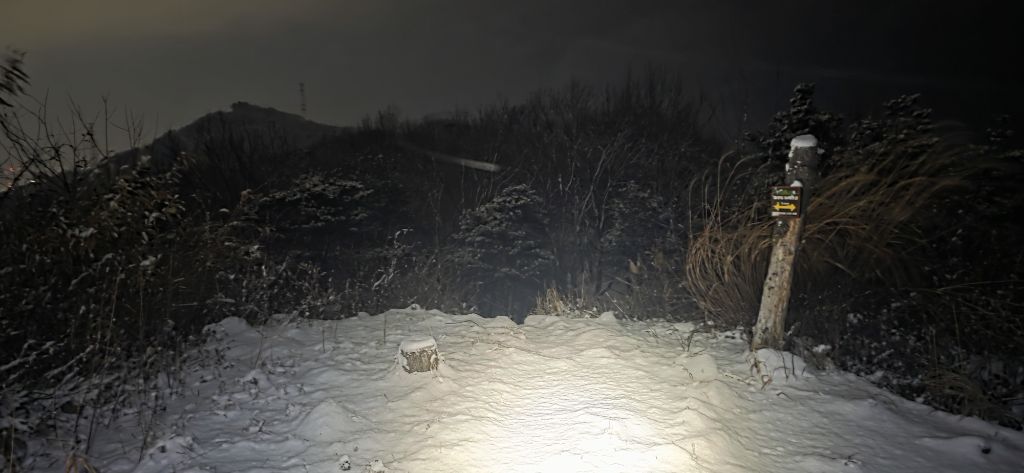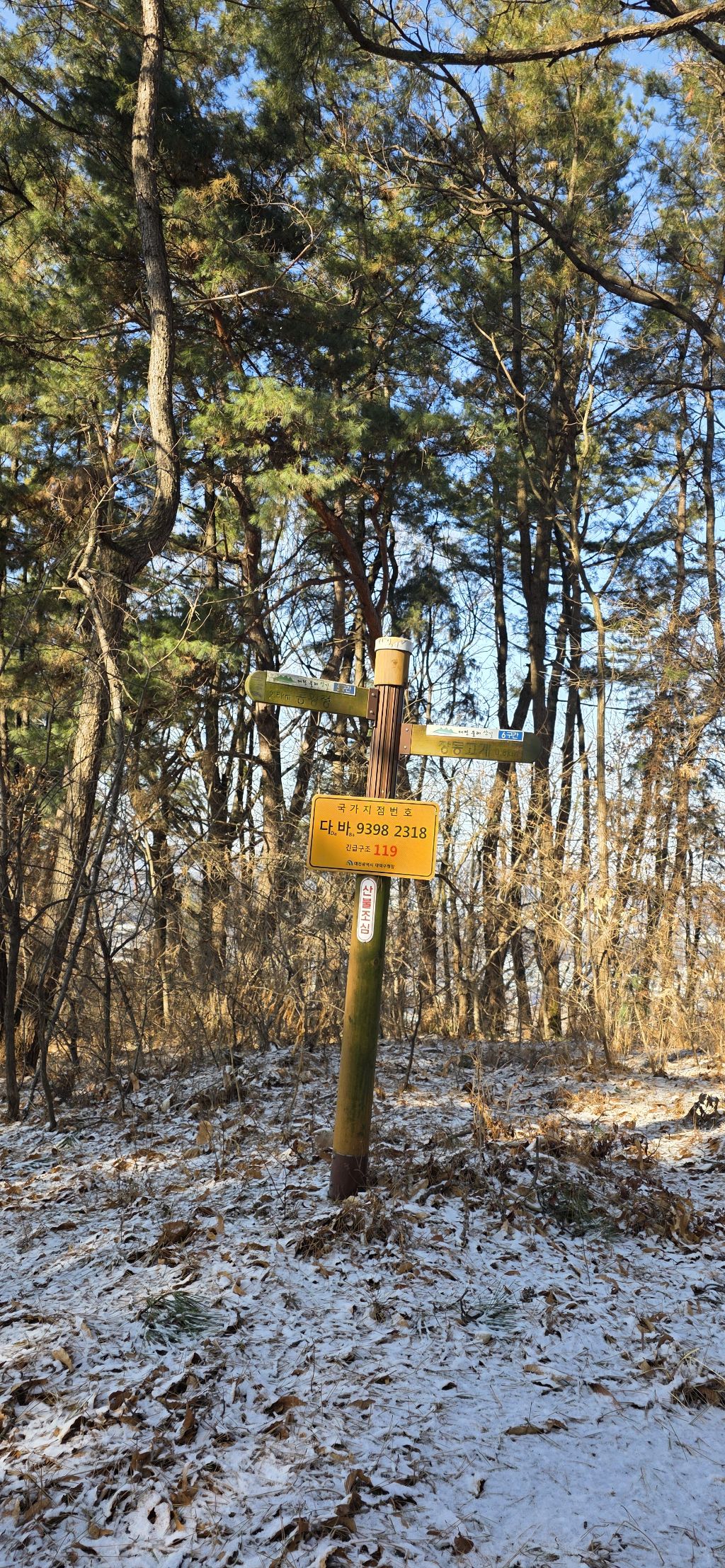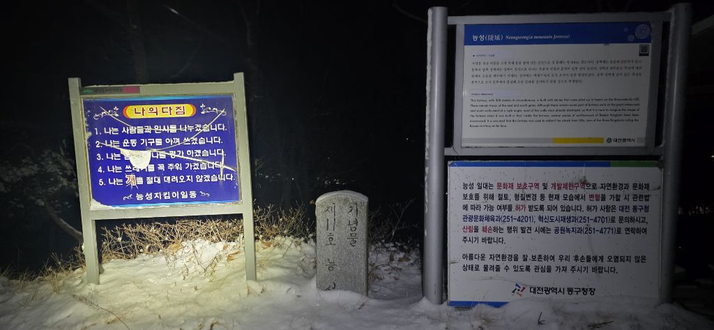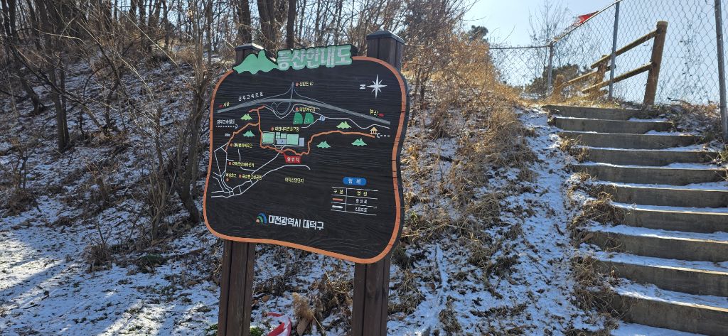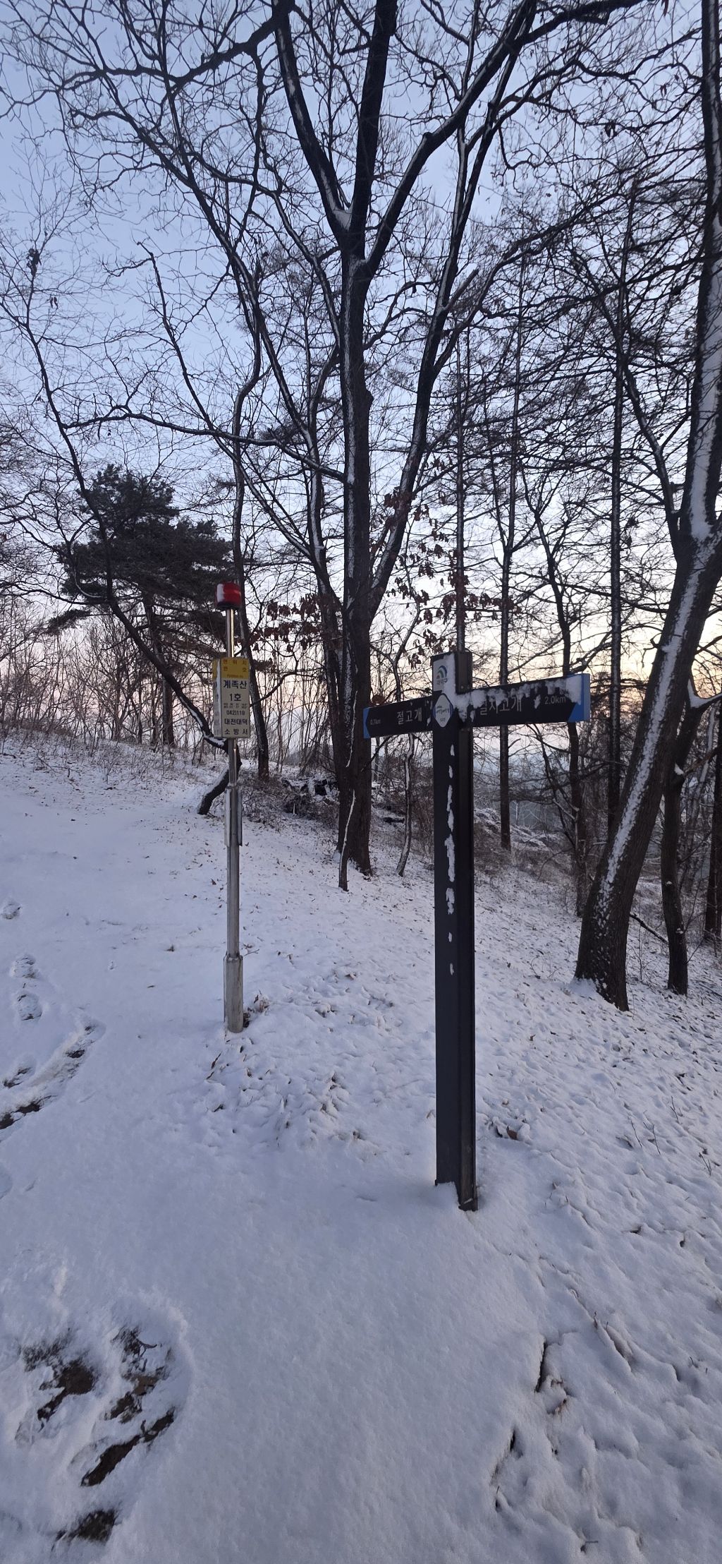 -식장지맥을 완성하기 위해서 지난번 날머리 세천공원 주차장으로 갑니다 겨울철 세천공원에서 식장산까지 차도는 폐쇄입니다 빙판길 위험하여 겨울철 도로는 폐쇄입니다 주차장 도착이고 잠시 휴식인데 새벽부터 눈이 오기 시작합니다 등산에 영향을 미칠정도는 아닌 눈이고 둘레길과 겹쳐서 등로가 양호하여 강행하기로 합니다