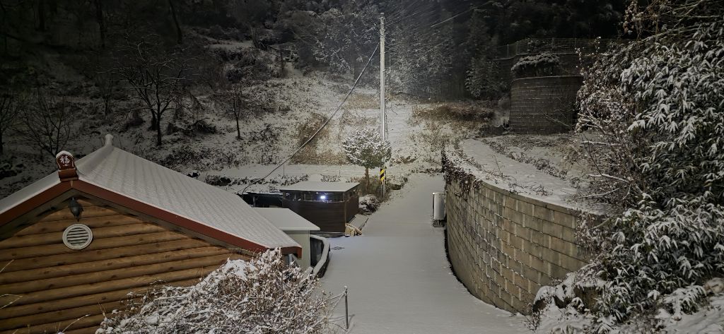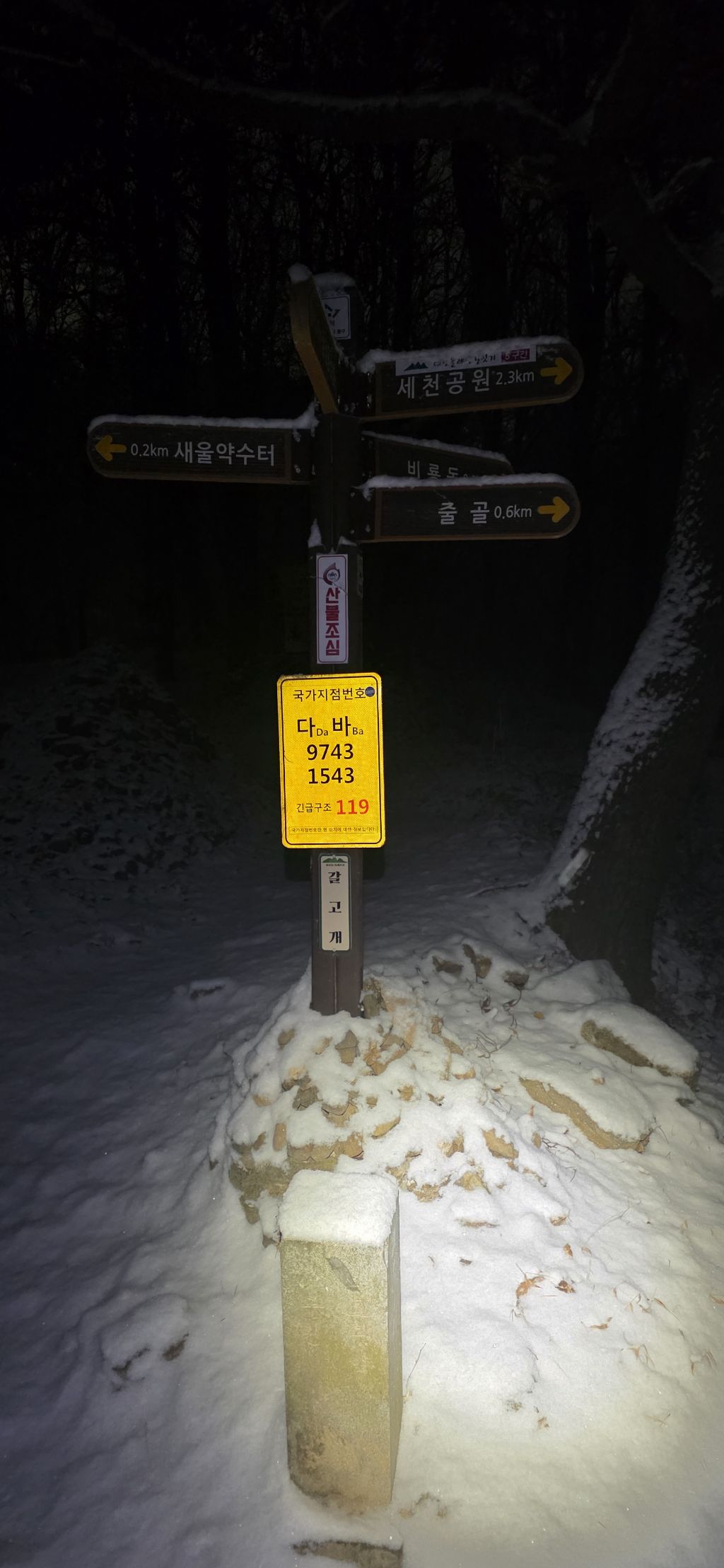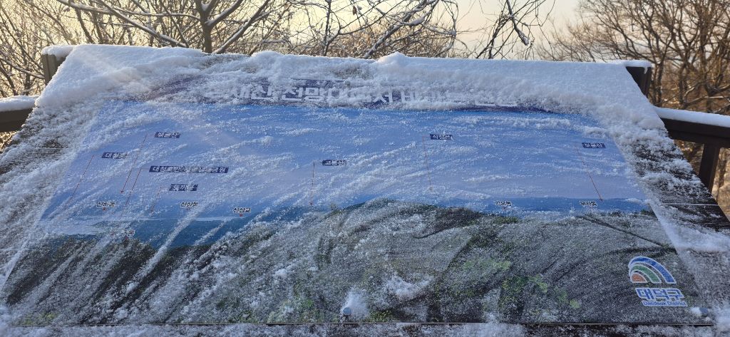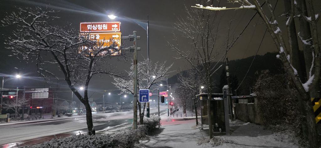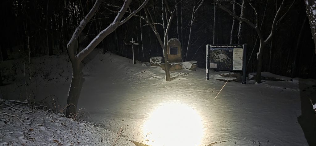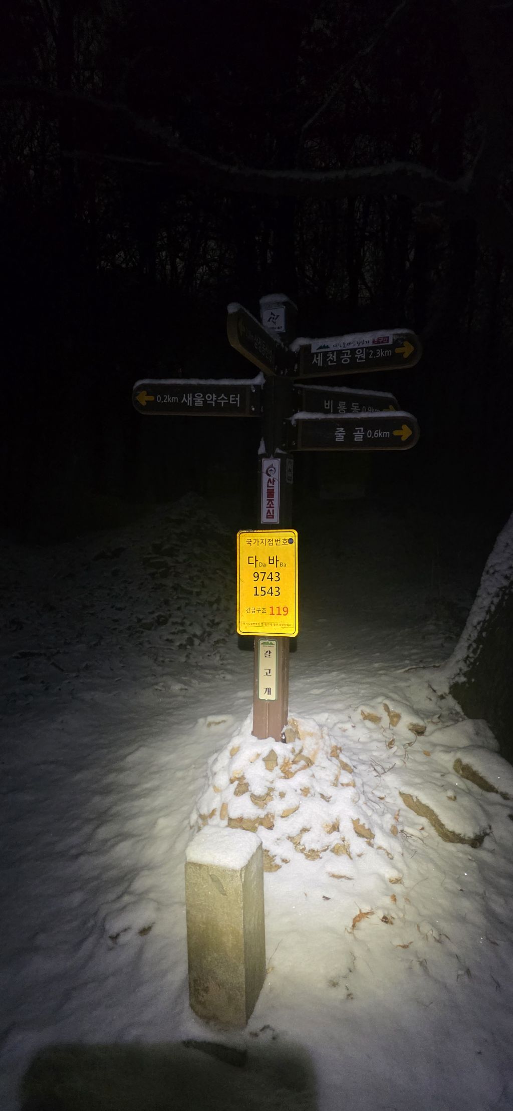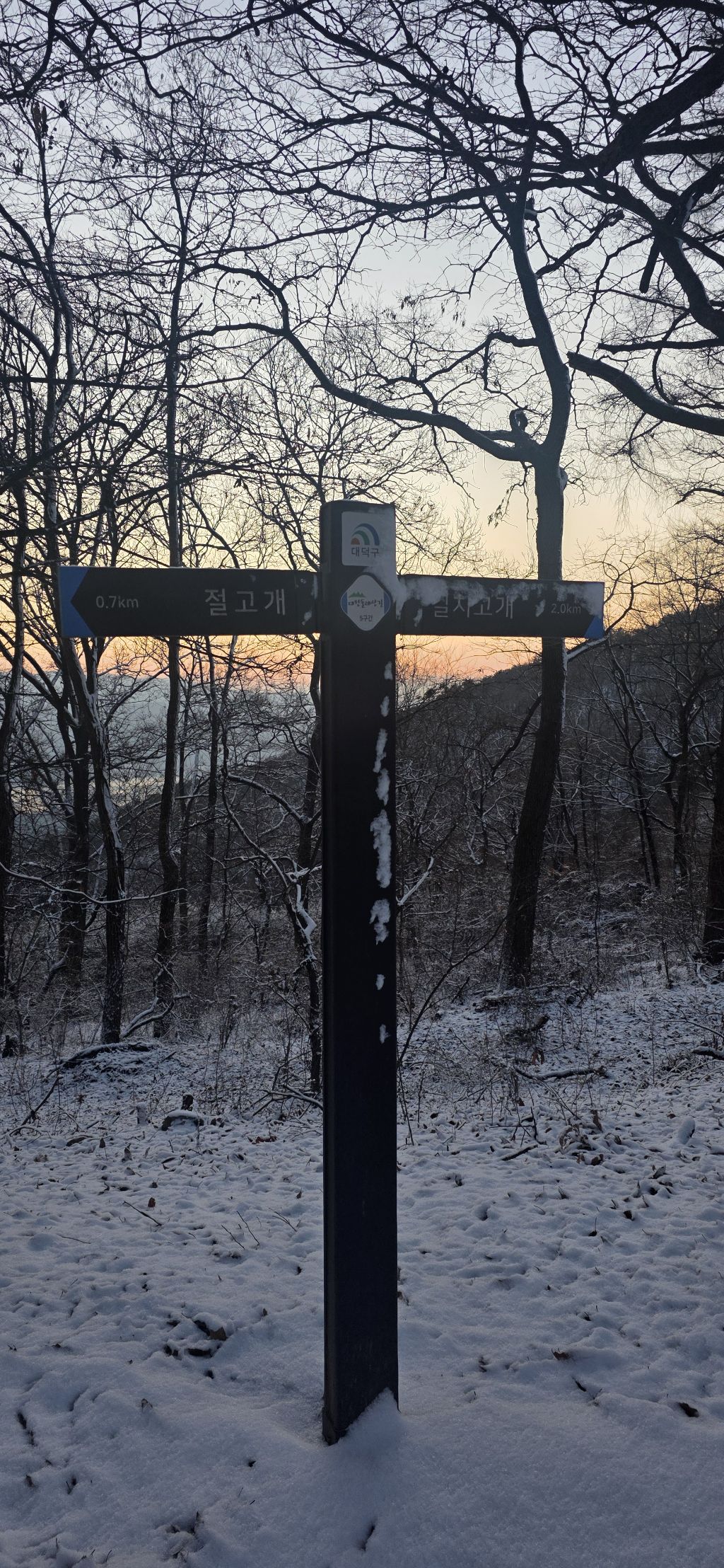 -식장지맥을 완성하기 위해서 지난번 날머리 세천공원 주차장으로 갑니다 겨울철 세천공원에서 식장산까지 차도는 폐쇄입니다 빙판길 위험하여 겨울철 도로는 폐쇄입니다 주차장 도착이고 잠시 휴식인데 새벽부터 눈이 오기 시작합니다 등산에 영향을 미칠정도는 아닌 눈이고 둘레길과 겹쳐서 등로가 양호하여 강행하기로 합니다