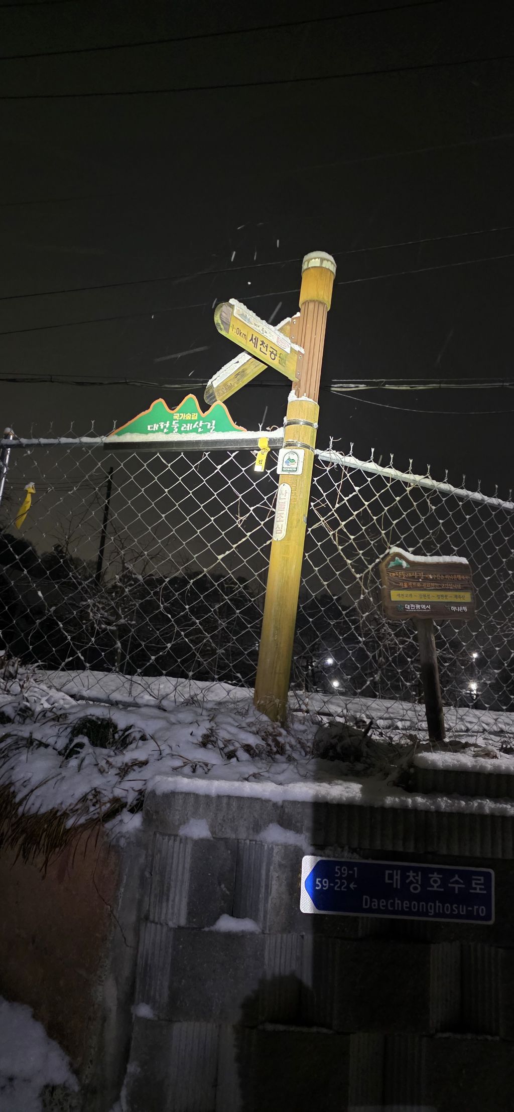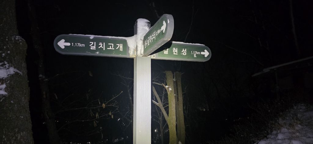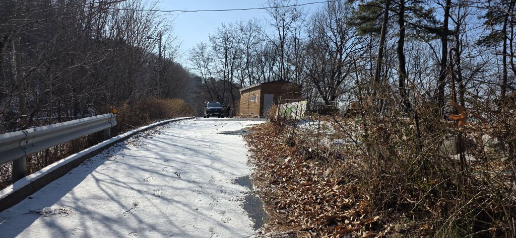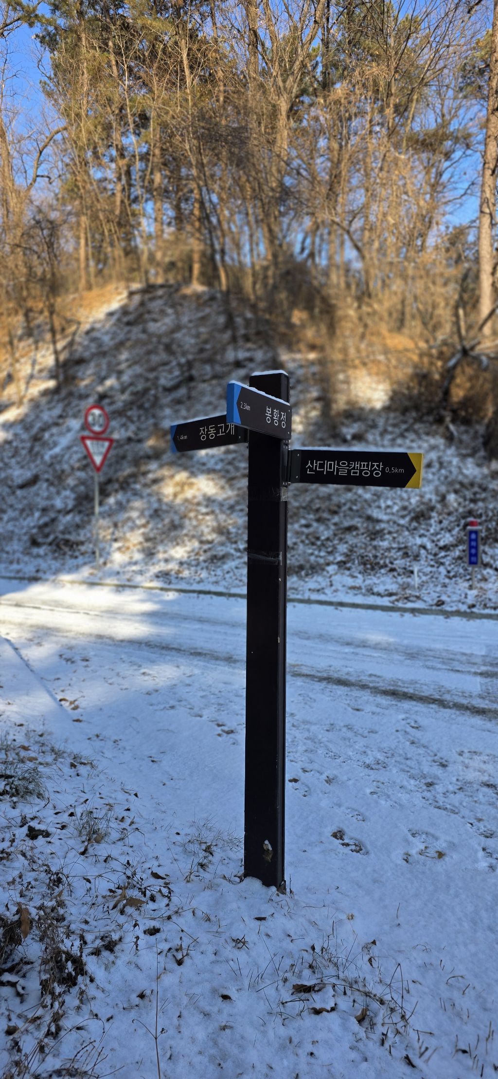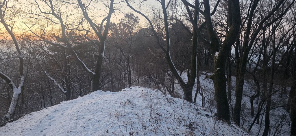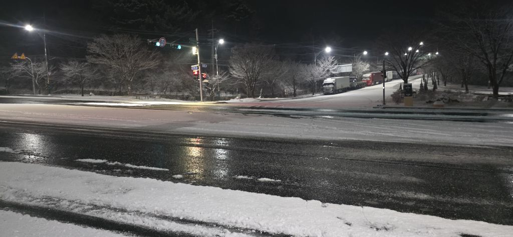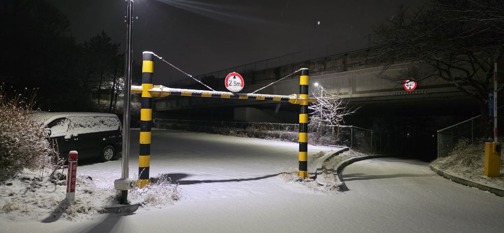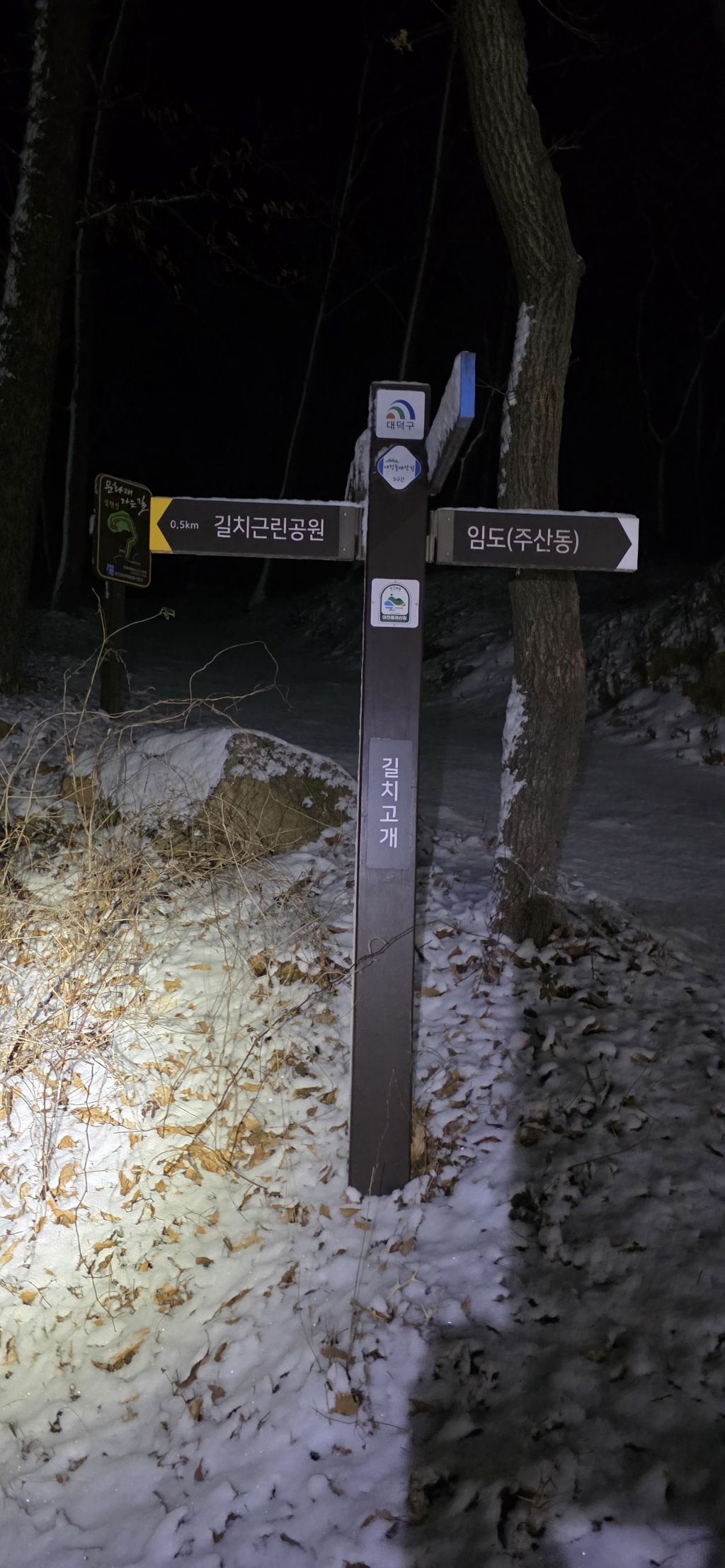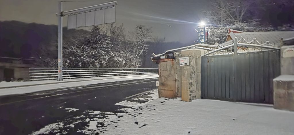 -식장지맥을 완성하기 위해서 지난번 날머리 세천공원 주차장으로 갑니다 겨울철 세천공원에서 식장산까지 차도는 폐쇄입니다 빙판길 위험하여 겨울철 도로는 폐쇄입니다 주차장 도착이고 잠시 휴식인데 새벽부터 눈이 오기 시작합니다 등산에 영향을 미칠정도는 아닌 눈이고 둘레길과 겹쳐서 등로가 양호하여 강행하기로 합니다