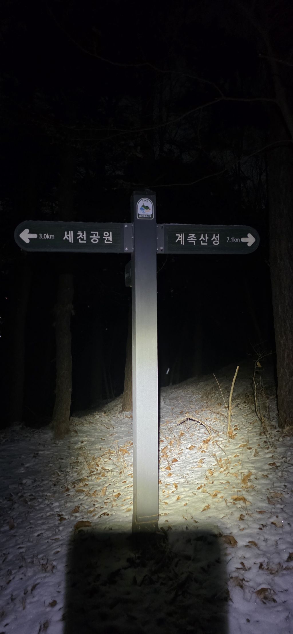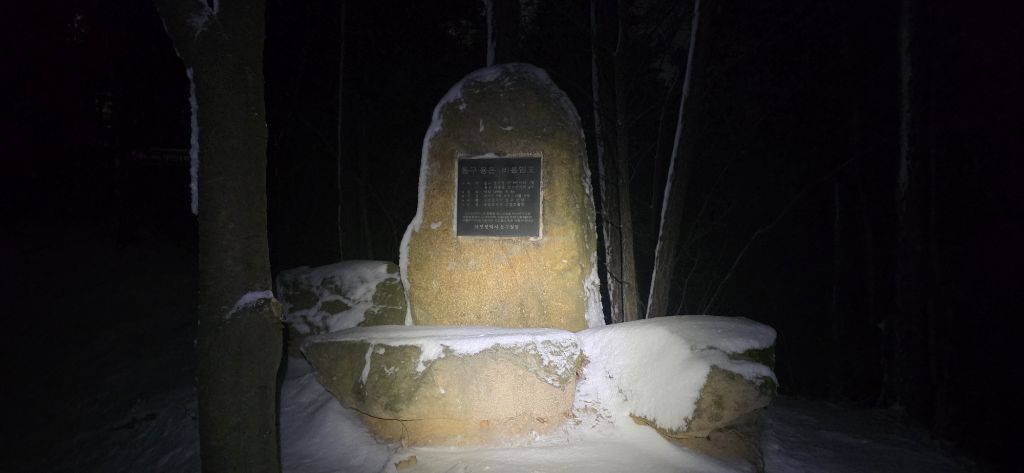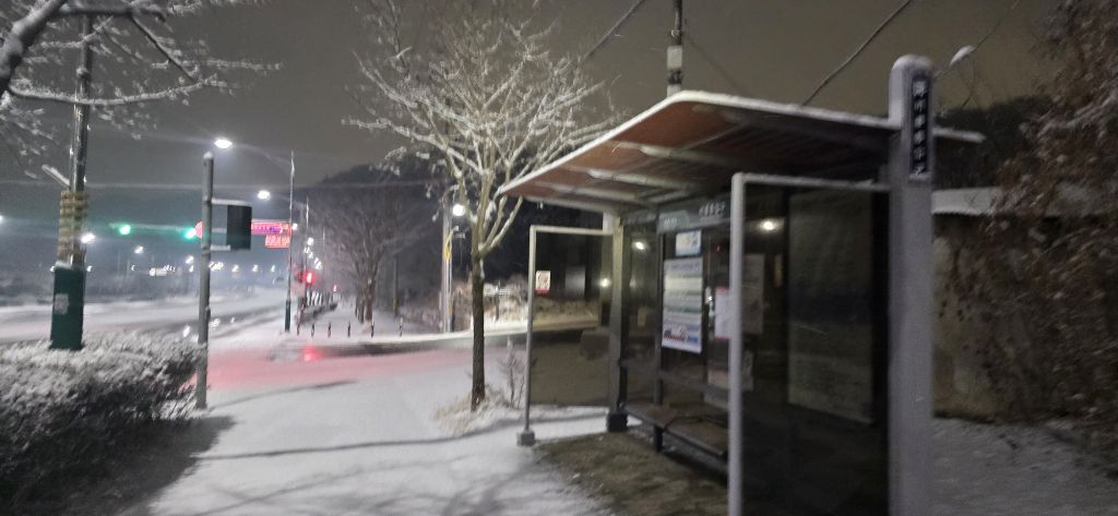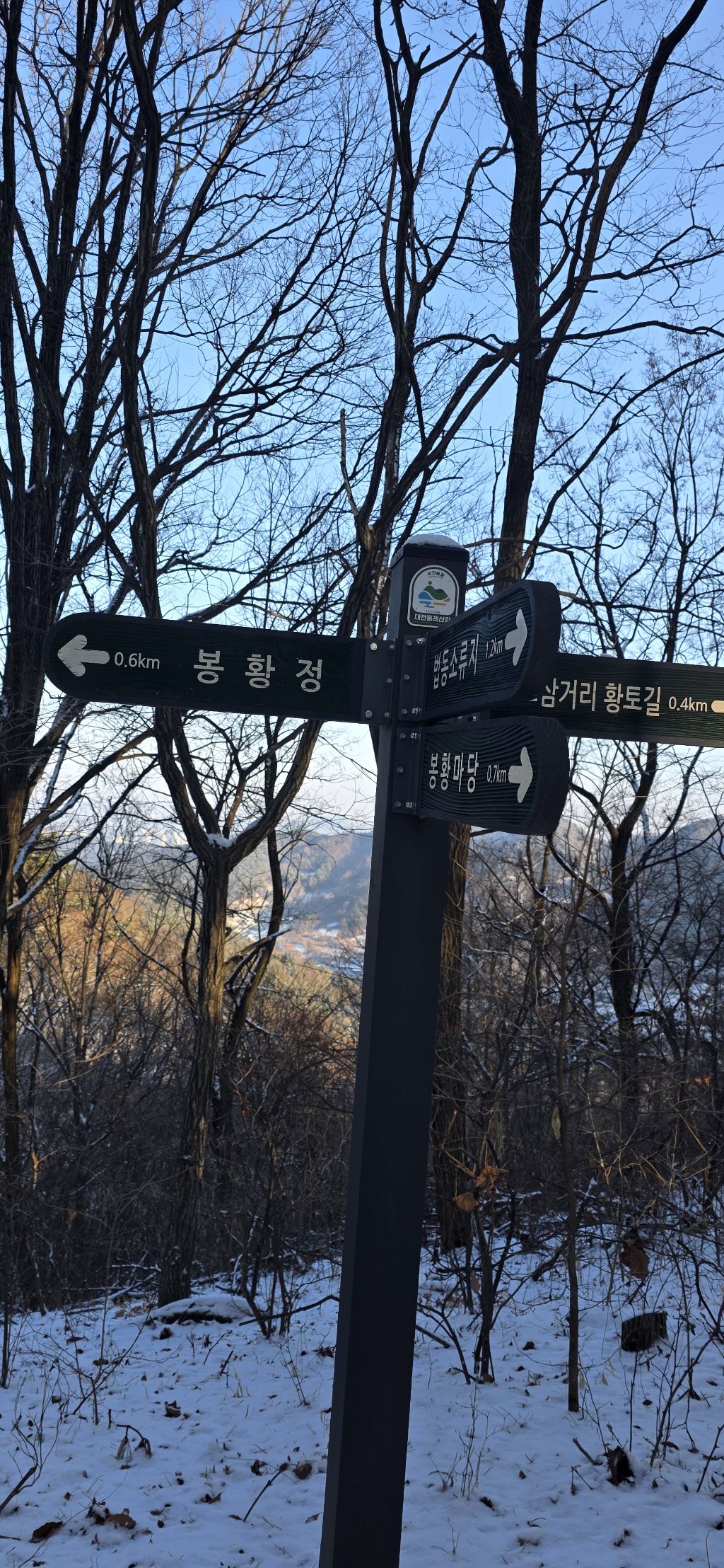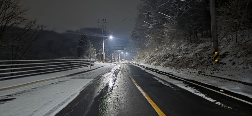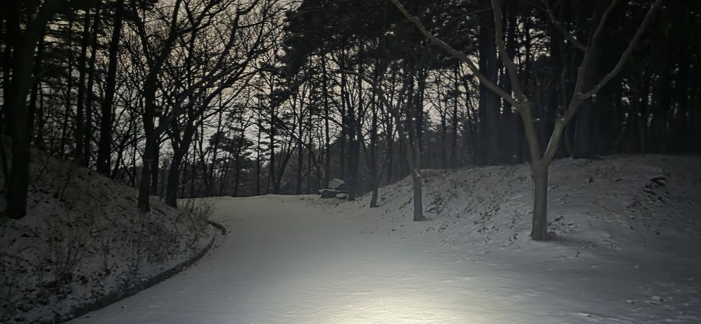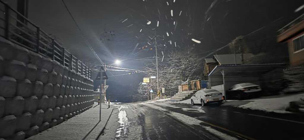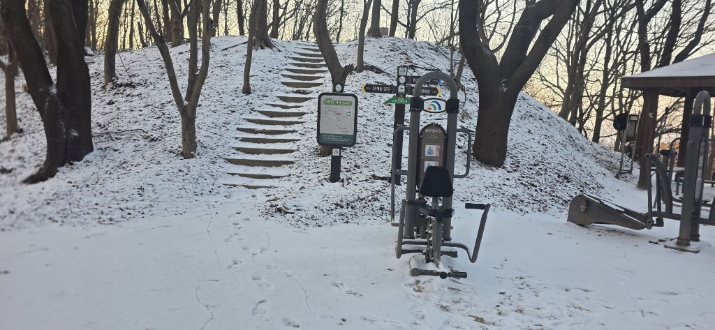 -식장지맥을 완성하기 위해서 지난번 날머리 세천공원 주차장으로 갑니다 겨울철 세천공원에서 식장산까지 차도는 폐쇄입니다 빙판길 위험하여 겨울철 도로는 폐쇄입니다 주차장 도착이고 잠시 휴식인데 새벽부터 눈이 오기 시작합니다 등산에 영향을 미칠정도는 아닌 눈이고 둘레길과 겹쳐서 등로가 양호하여 강행하기로 합니다