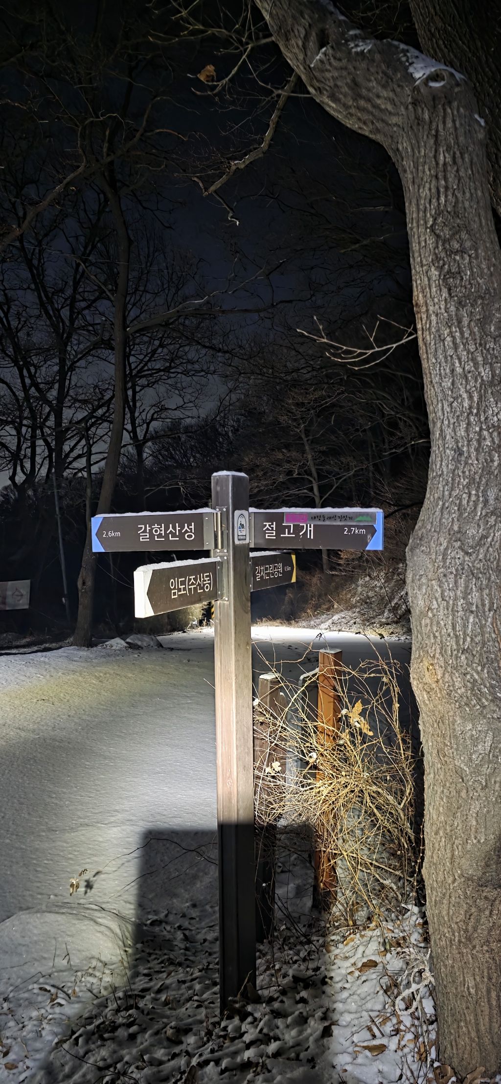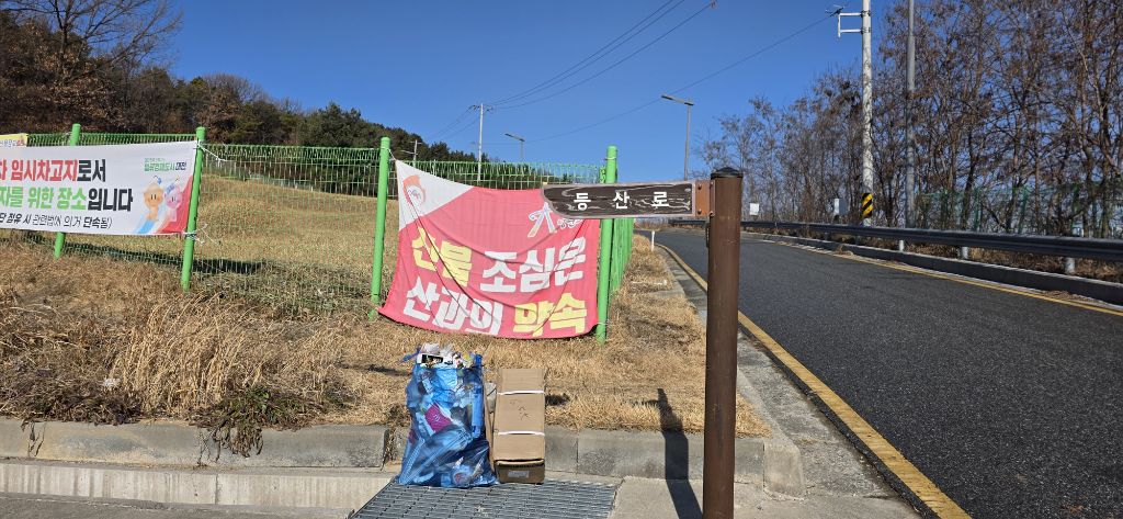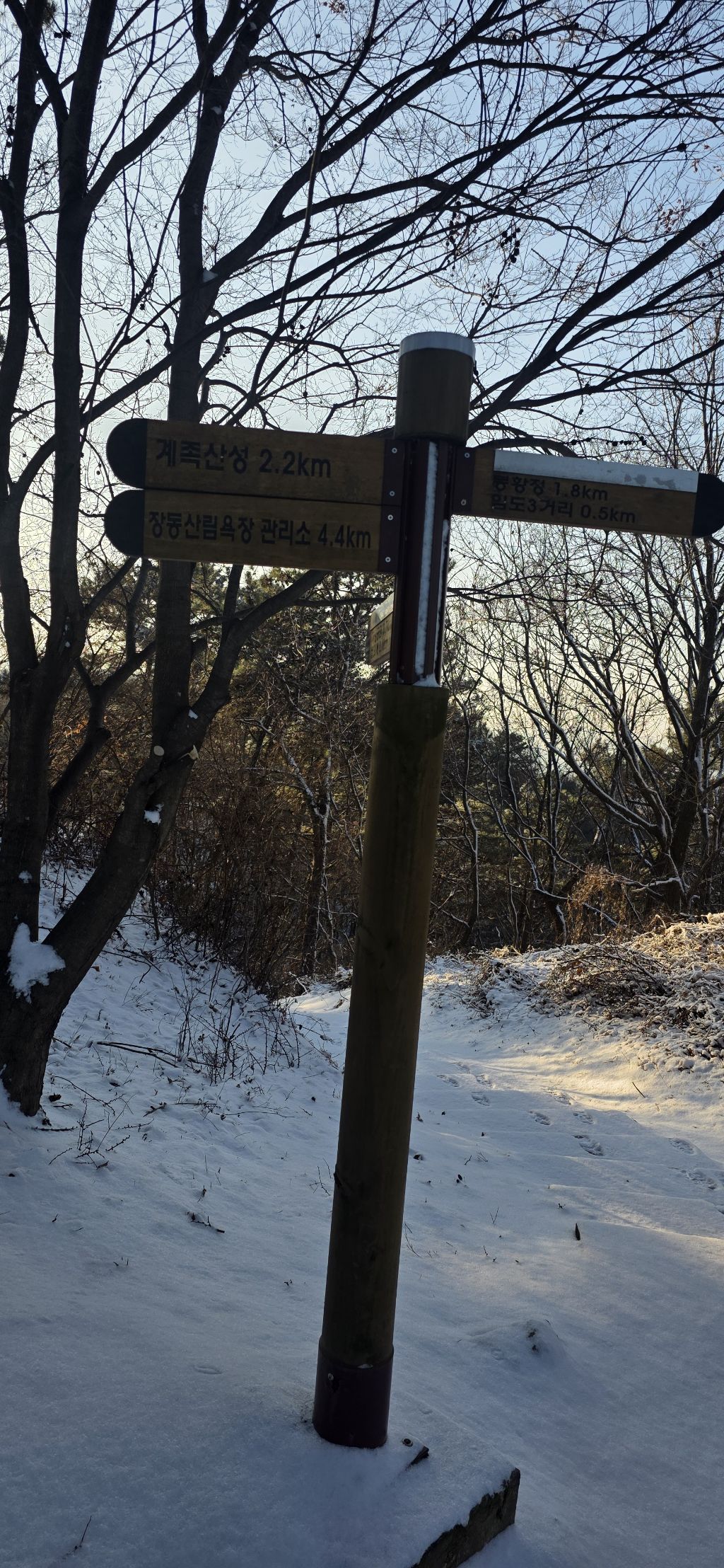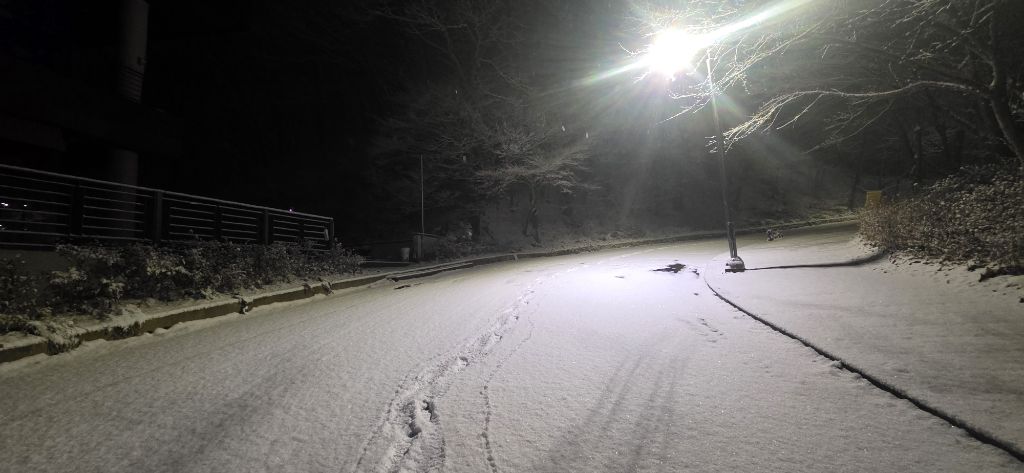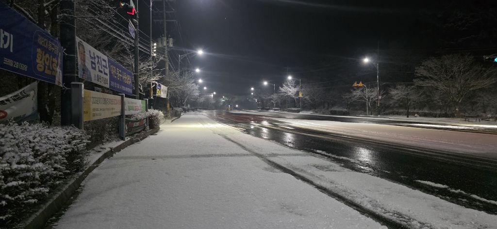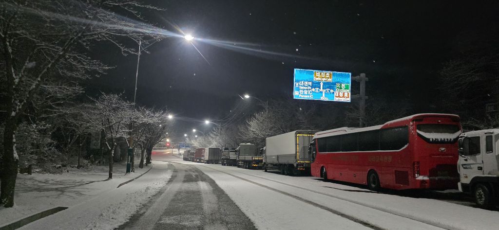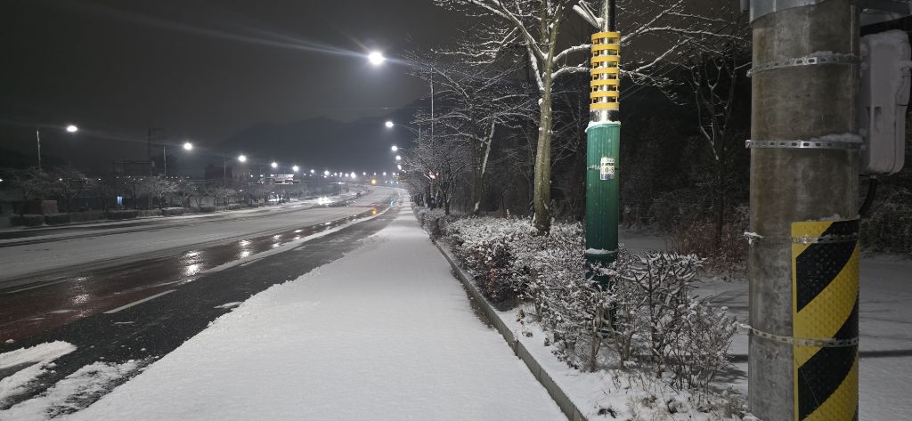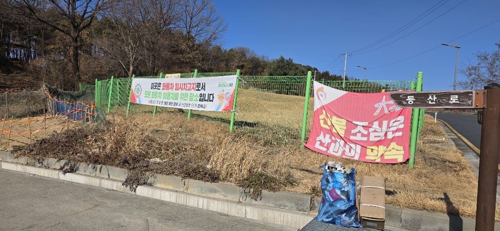 -식장지맥을 완성하기 위해서 지난번 날머리 세천공원 주차장으로 갑니다 겨울철 세천공원에서 식장산까지 차도는 폐쇄입니다 빙판길 위험하여 겨울철 도로는 폐쇄입니다 주차장 도착이고 잠시 휴식인데 새벽부터 눈이 오기 시작합니다 등산에 영향을 미칠정도는 아닌 눈이고 둘레길과 겹쳐서 등로가 양호하여 강행하기로 합니다