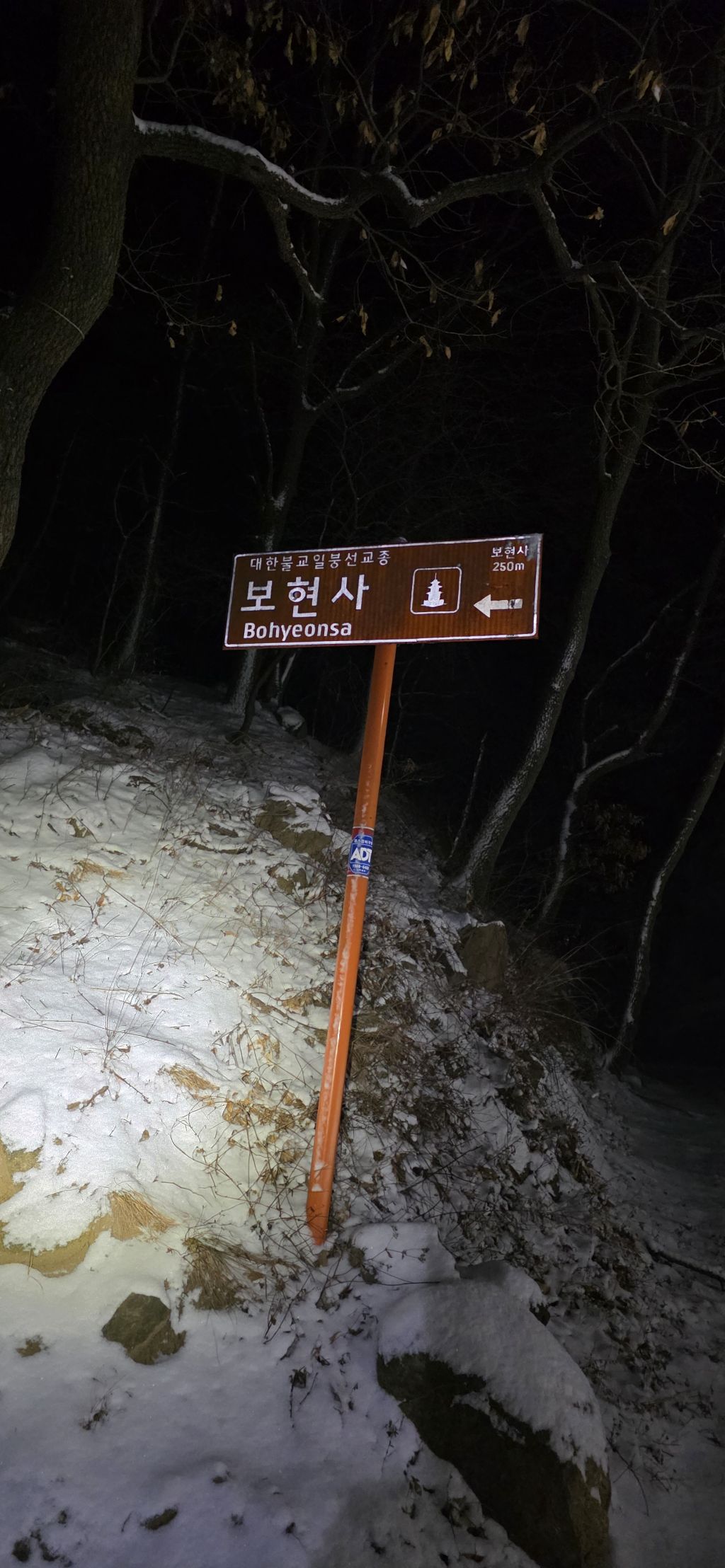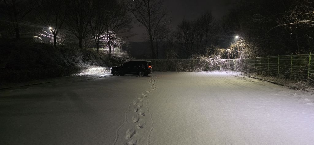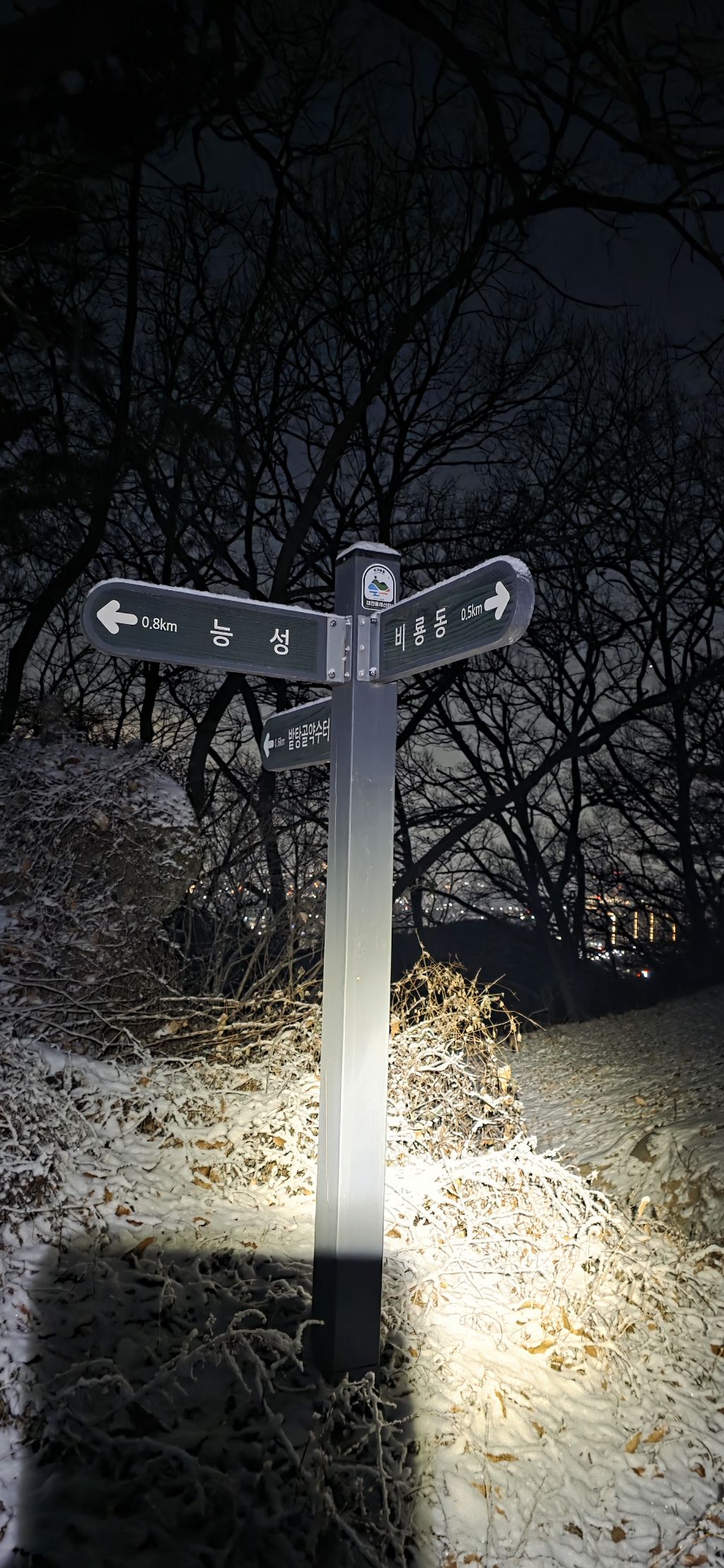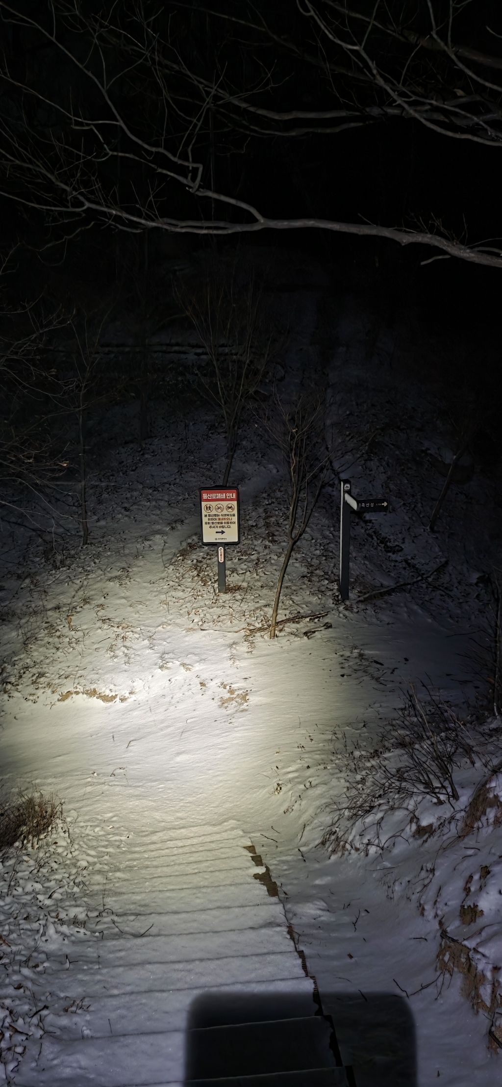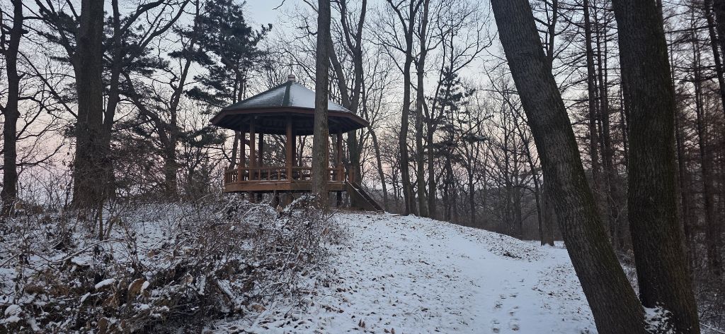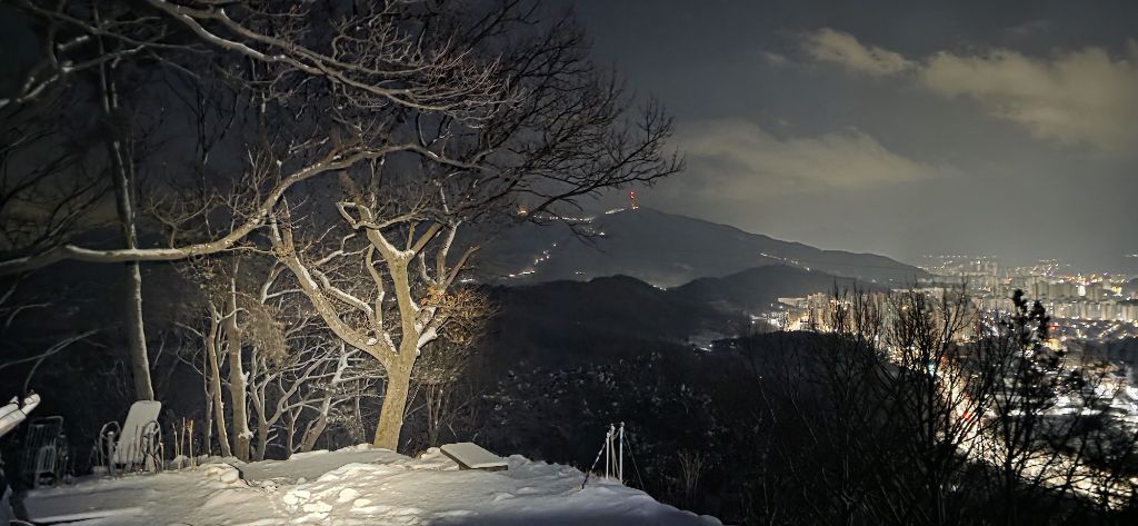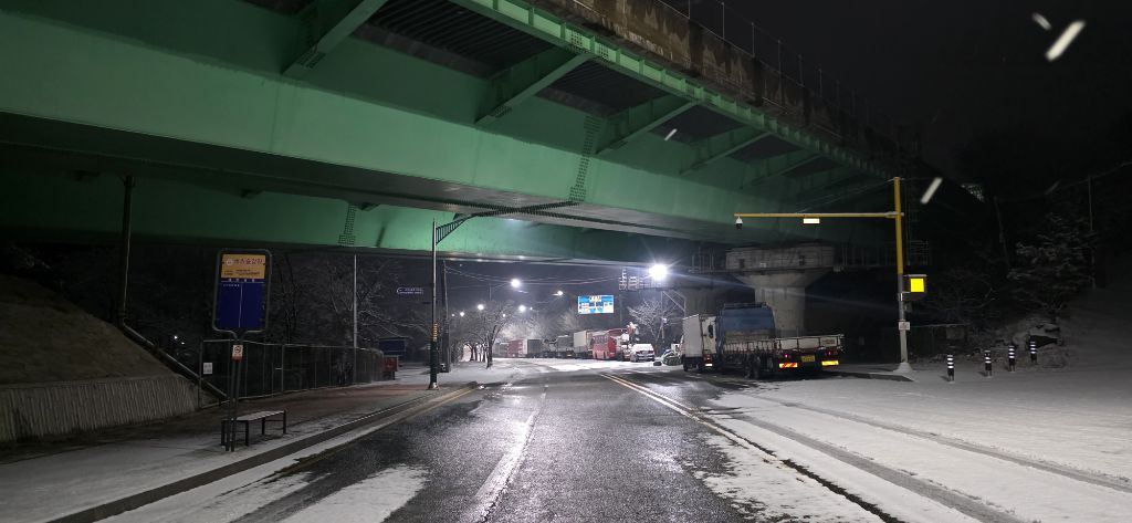 -식장지맥을 완성하기 위해서 지난번 날머리 세천공원 주차장으로 갑니다 겨울철 세천공원에서 식장산까지 차도는 폐쇄입니다 빙판길 위험하여 겨울철 도로는 폐쇄입니다 주차장 도착이고 잠시 휴식인데 새벽부터 눈이 오기 시작합니다 등산에 영향을 미칠정도는 아닌 눈이고 둘레길과 겹쳐서 등로가 양호하여 강행하기로 합니다