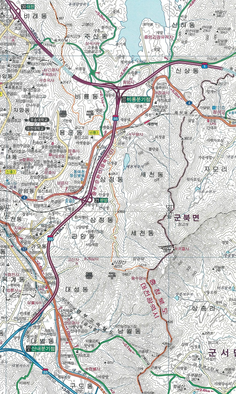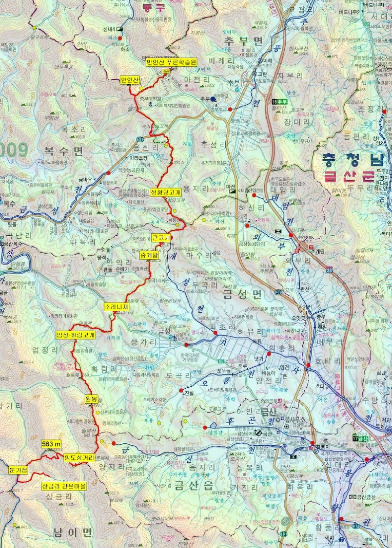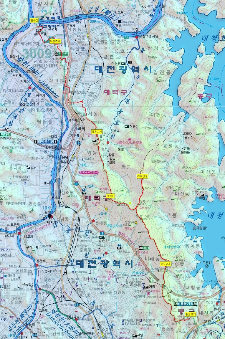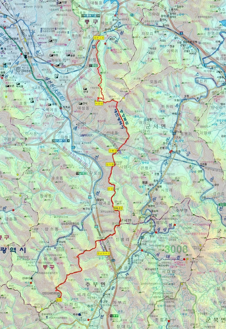 산행코스: 세천고개-장승배기-갈고개-솔랑산-313.8(삼각점봉)-334.7봉-절고개-399.1(성재산 1등 삼각점봉)-367.9봉-423.9(계족산)-216.5(삼각점봉)-새뜸고개-221.8봉(와등봉)-장동고개-선바위고개-목상초등학교-합수점(갑천/금강)