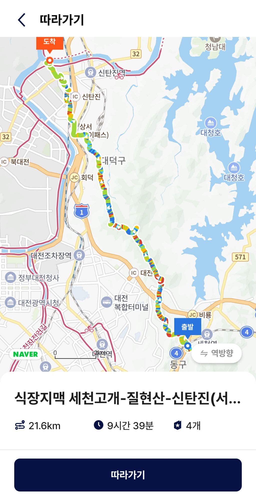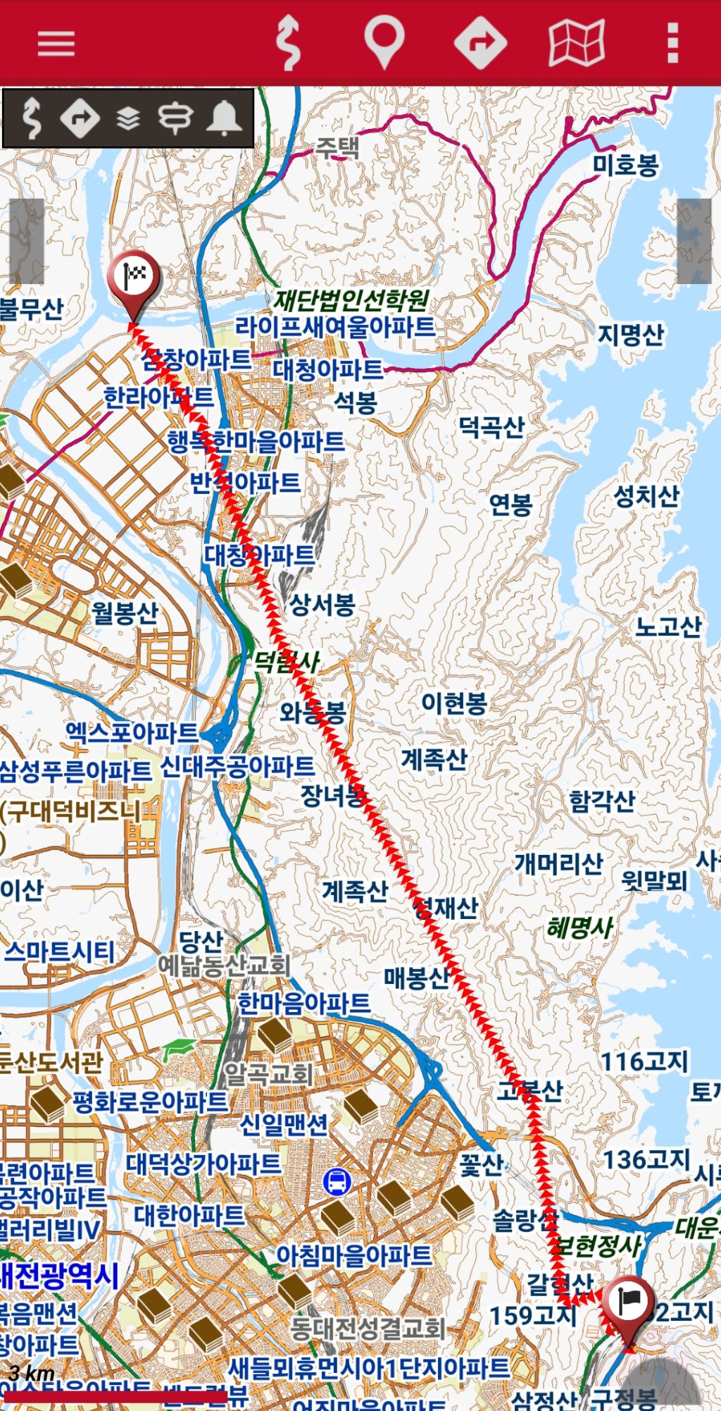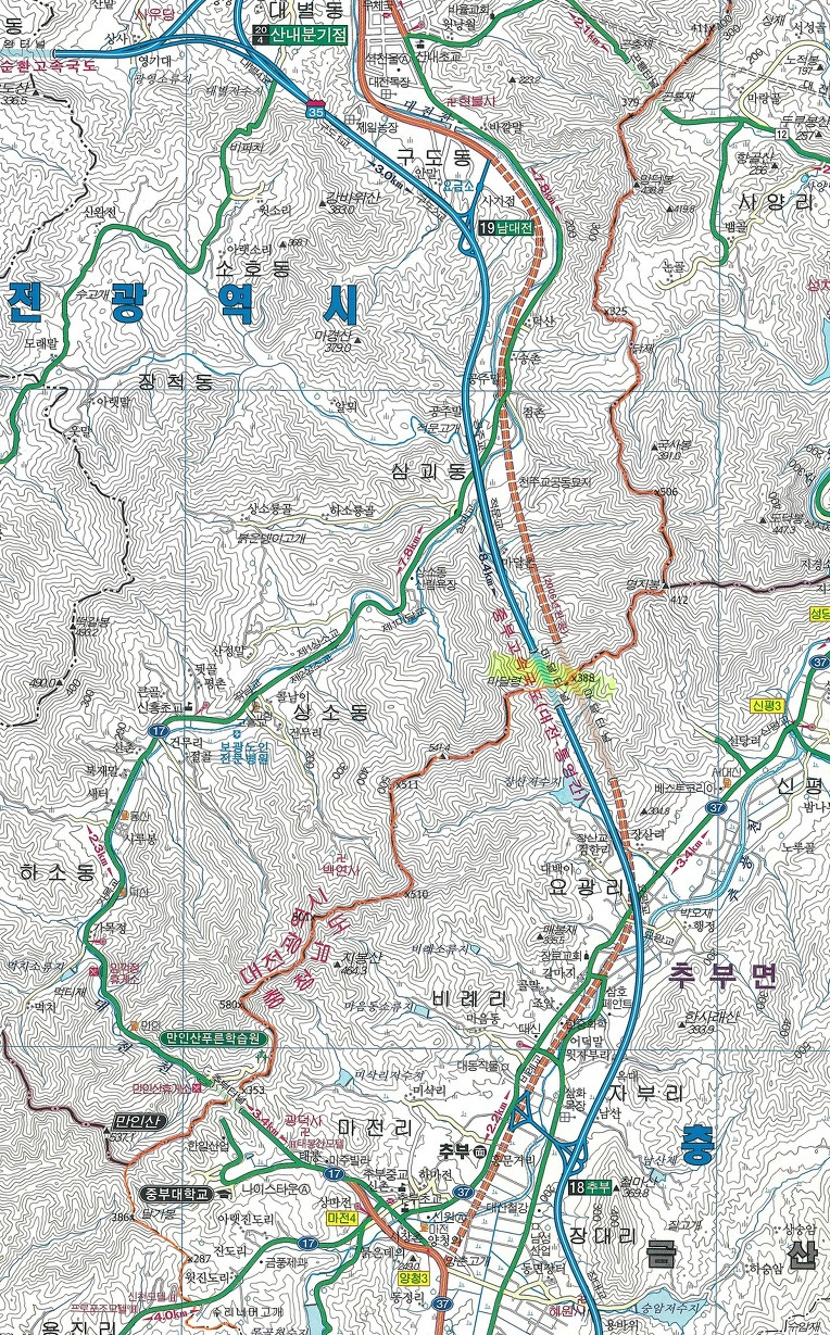 산행코스: 세천고개-장승배기-갈고개-솔랑산-313.8(삼각점봉)-334.7봉-절고개-399.1(성재산 1등 삼각점봉)-367.9봉-423.9(계족산)-216.5(삼각점봉)-새뜸고개-221.8봉(와등봉)-장동고개-선바위고개-목상초등학교-합수점(갑천/금강)
