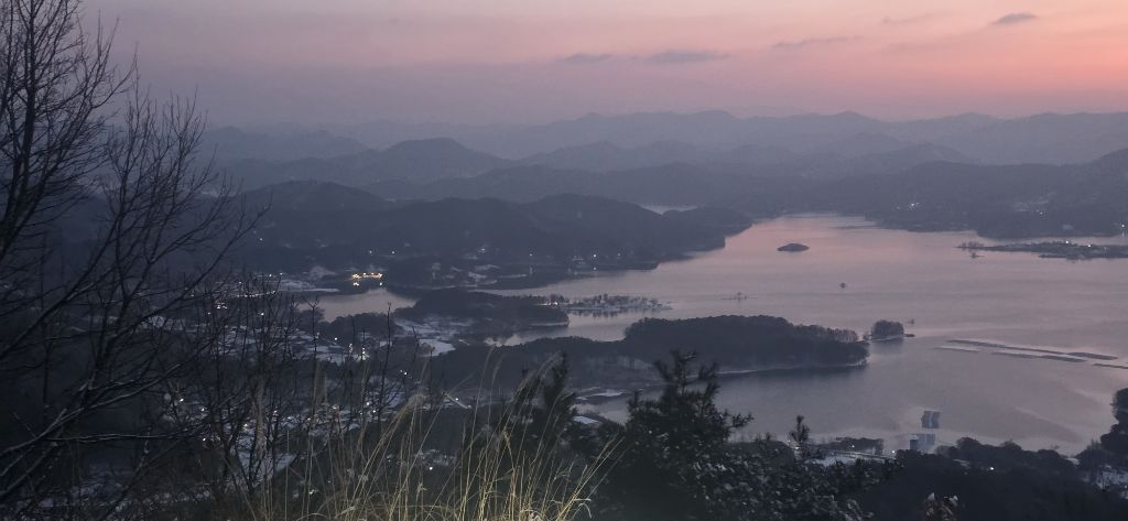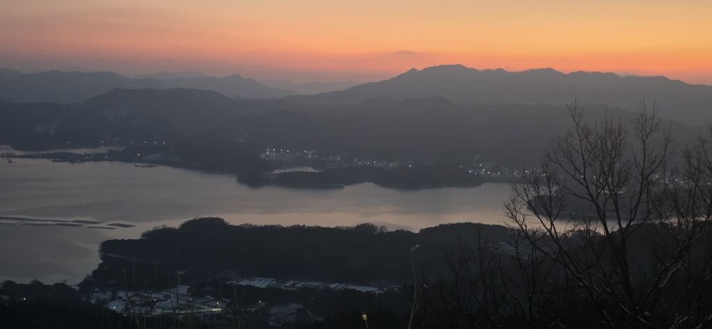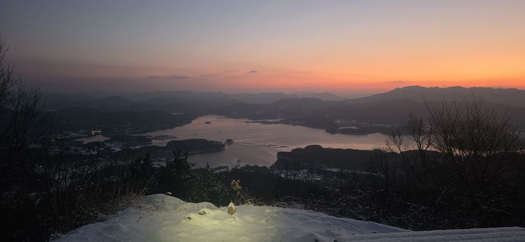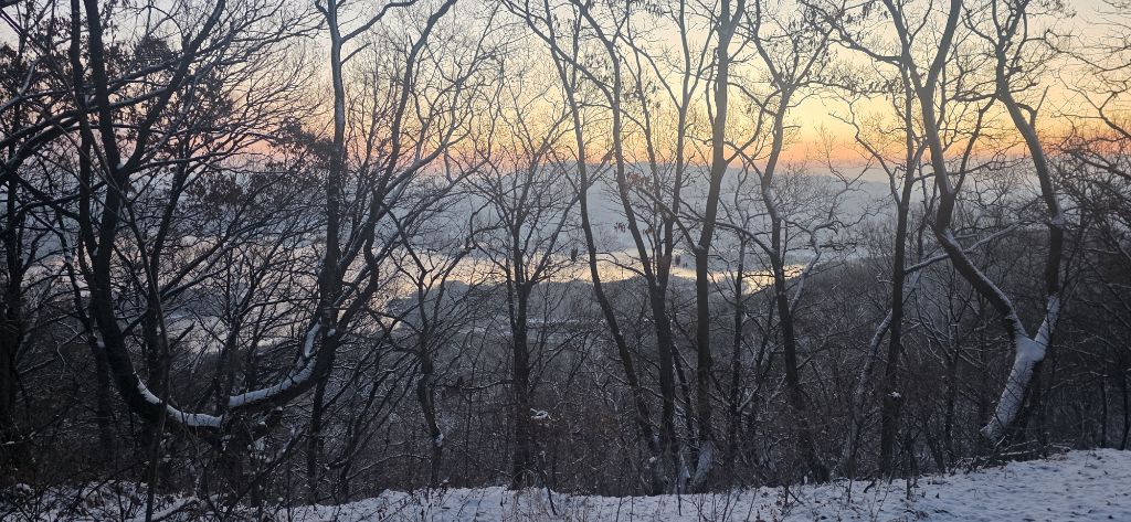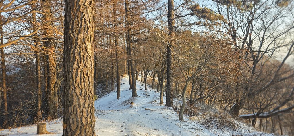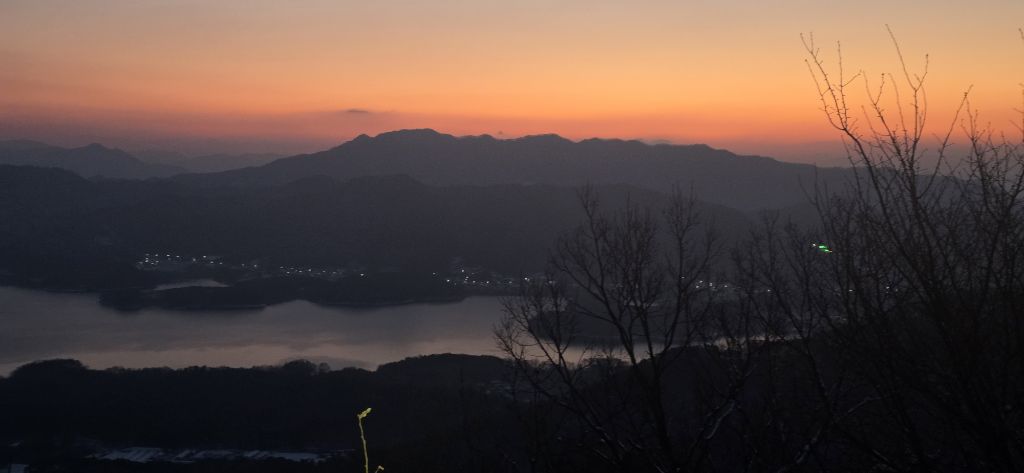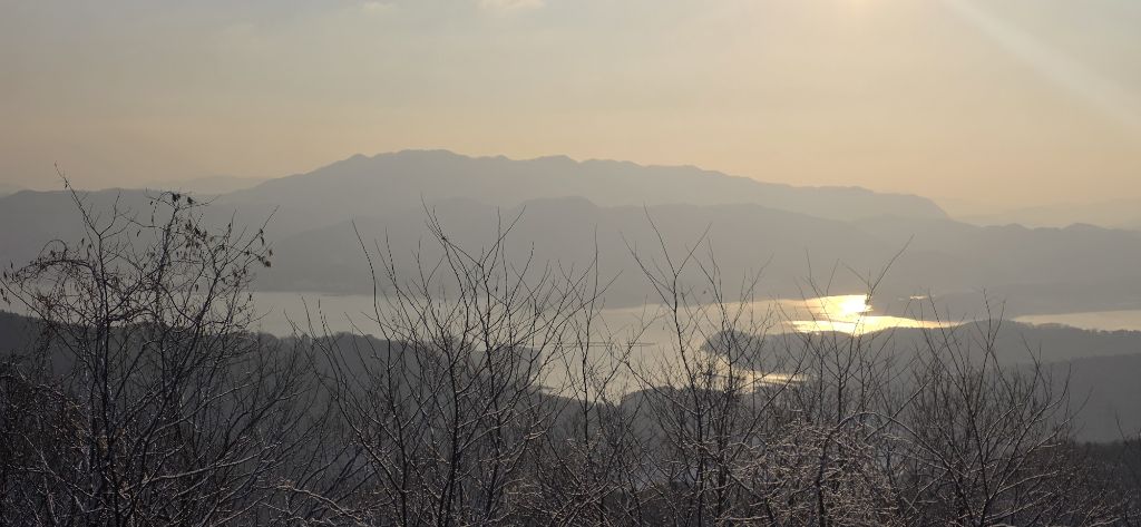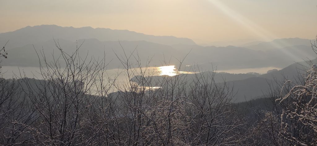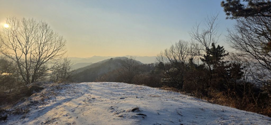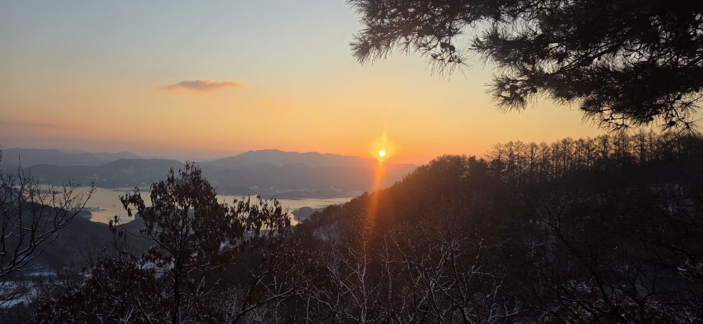 -눈산행으로 출발이고 세천삼거리를 지나고 장승배기까지 도로로 진행이고 요기서 좌측으로 둘레길과 접속하여 본격적인 3구간 산행입니다 갈고개를 지나고 고봉산을 묘지를 지나고 등로가 아닌 길로 오르고 내림이고 다시 올라서 칠현산입니다 진행주 대청호 일출을 감상합니다 호수에서 포함한 일출이 감동입니다 한참을 일출을 감상하고 담아봅니다