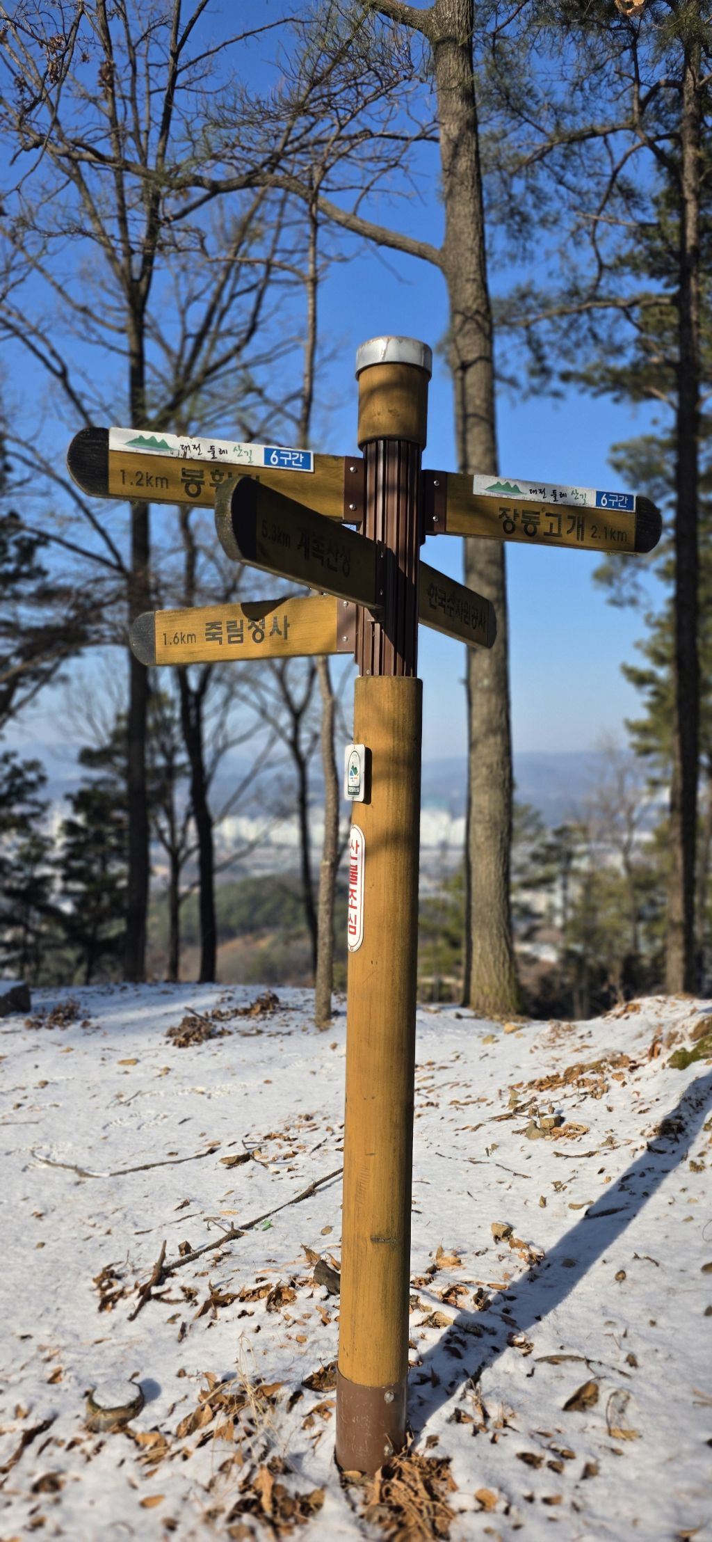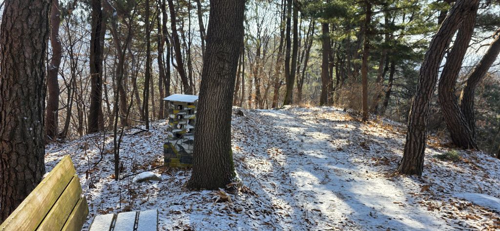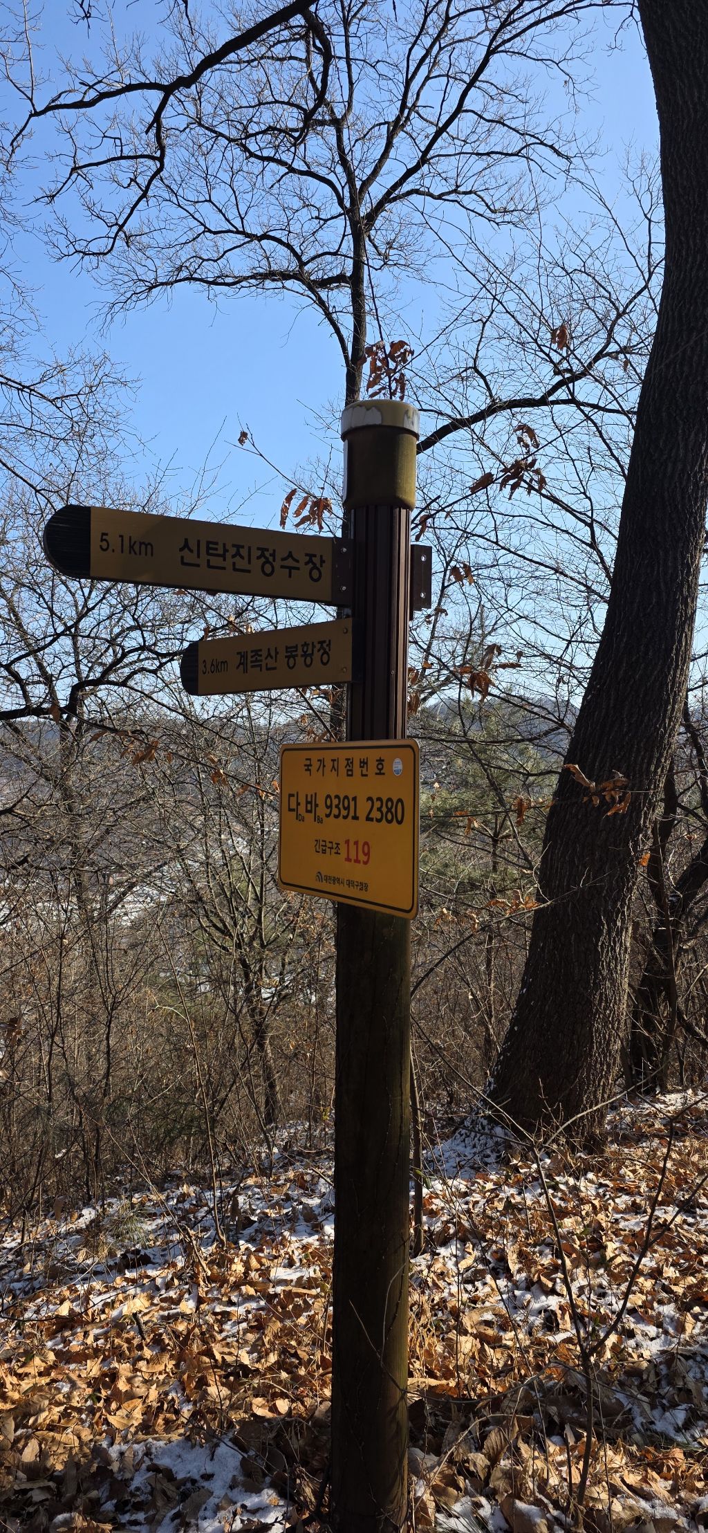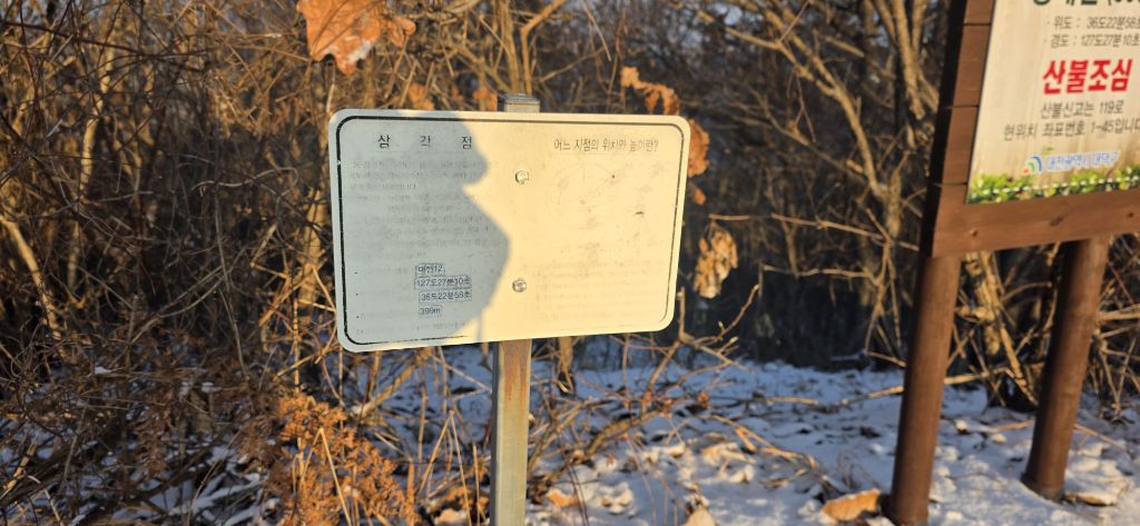 -한참을 진행하여 성재산 갈림길입니다 성재산 왕복 400m 정도입니다 성재산 대전 12 1등 삼각점봉입니다 계족산성을 방향입니다 저는 요기까지 성재산만 보고 백하여 지맥길로 이어갑니다 눈길로 진행 후 계족산을 오릅니다 식장지맥 계족산입니다 등산객에 부탁하여 인증을 합니다 좌측에 정자도 다녀옵니다 정자는 조망이 뛰어납니다